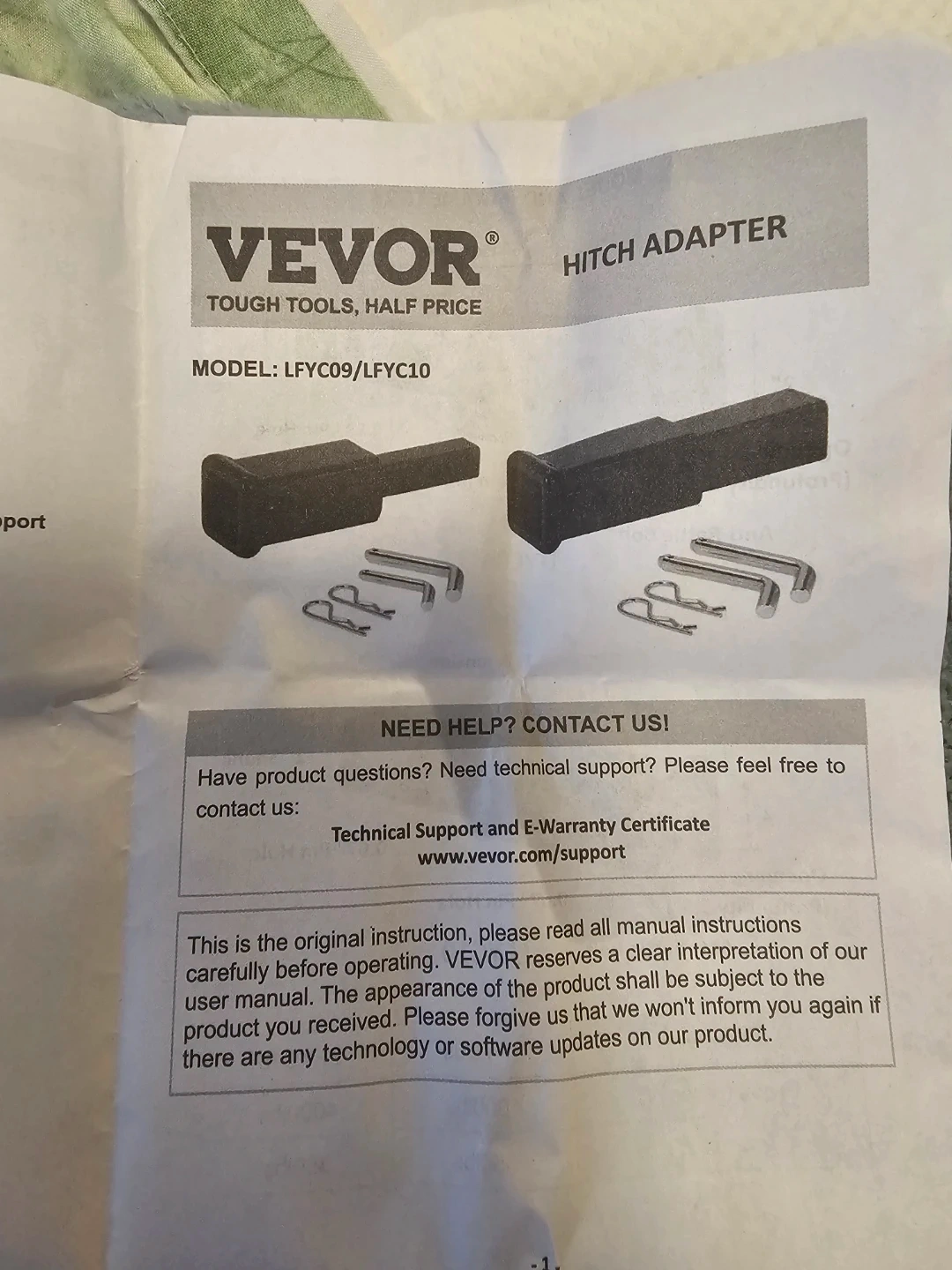 Selling a VEVOR hitch adapter, model LFYC09. It is a 1-1/4"-2" adapter with a 6" extension. The cross trailer weight is 4000lbs and the tongue weight is 250lbs. The size is 330*95*95mm. The box is included