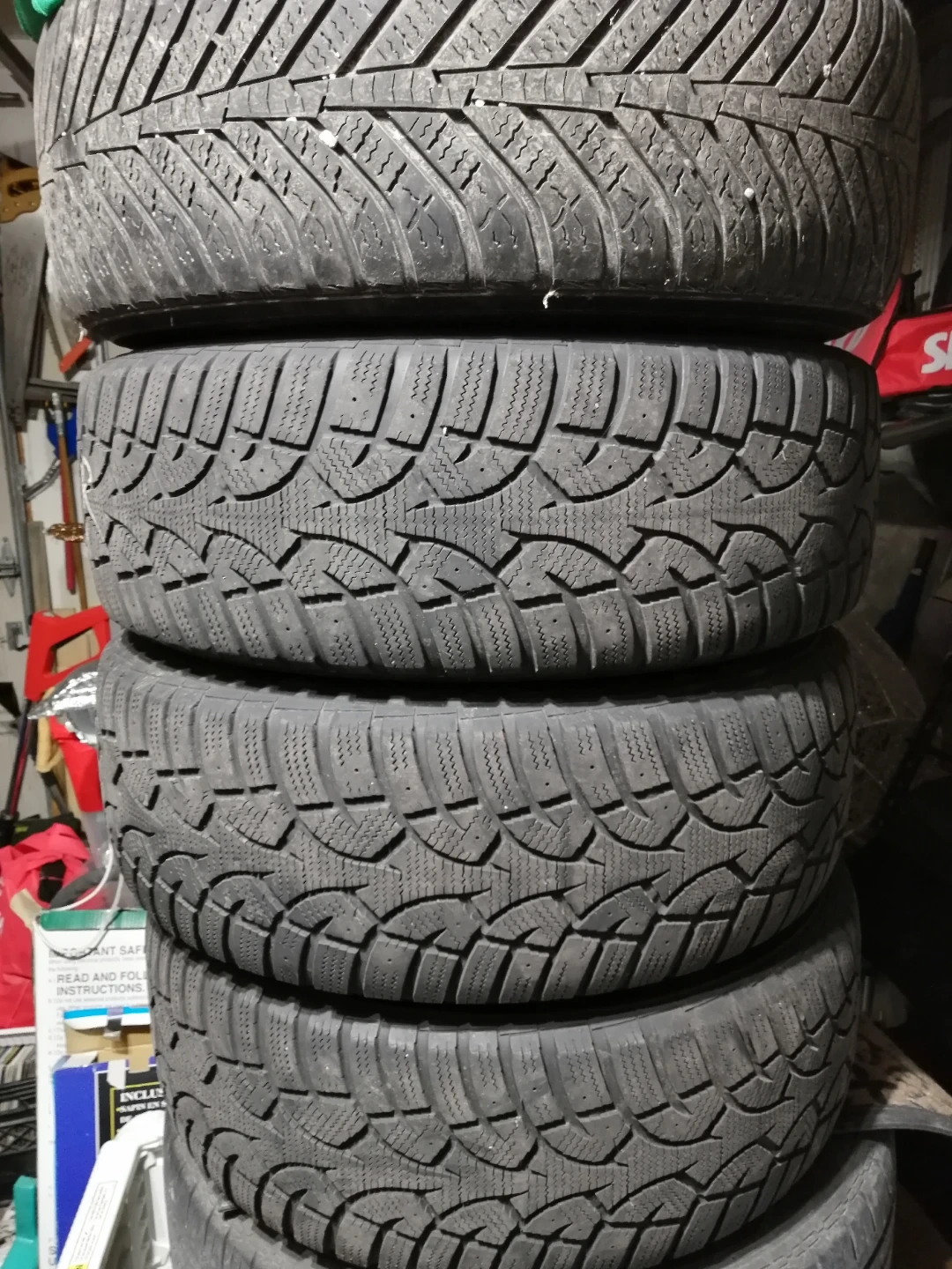 Selling a set of 4 used winter tires 215 65 15. They are on Hyundai/Kia steel rims in good shape with 5 x 114.3 bolt pattern. Tires show signs of wear and use, as seen in the photos. Winter tires are old with tread for 1 season.