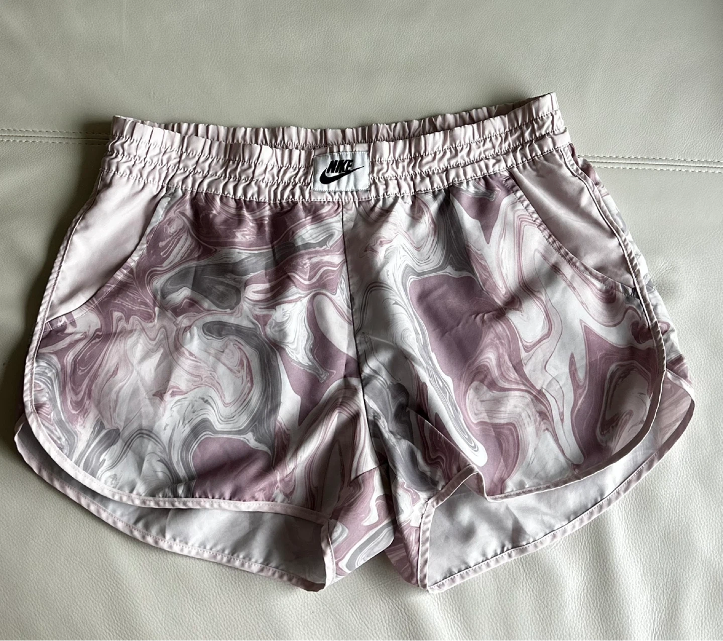 Selling a pair of Nike running shorts in size medium. They have a cool marble pattern and the classic Nike swoosh logo. Perfect for running or just lounging around!