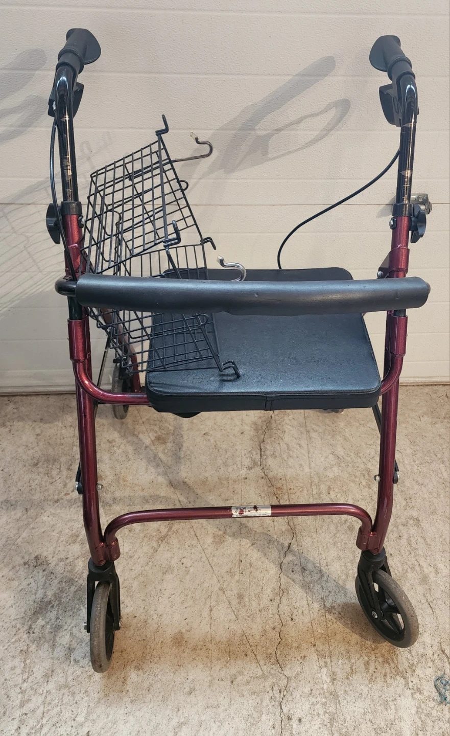 Here's a burgundy walker in good condition! It has a comfortable seat and a convenient basket for carrying items. Perfect for anyone needing a little extra support while getting around.