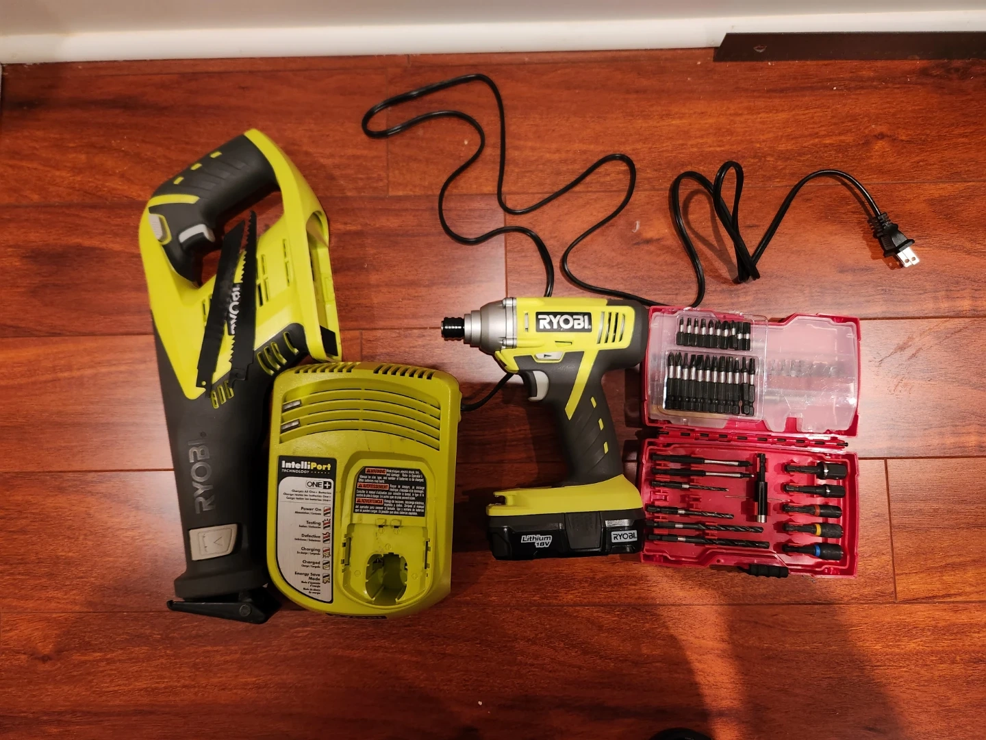 Selling a Ryobi ONE+ cordless reciprocating saw and impact driver combo! Includes the charger and a case of assorted bits and drills. Great for small home projects or repairs. Like NEW
