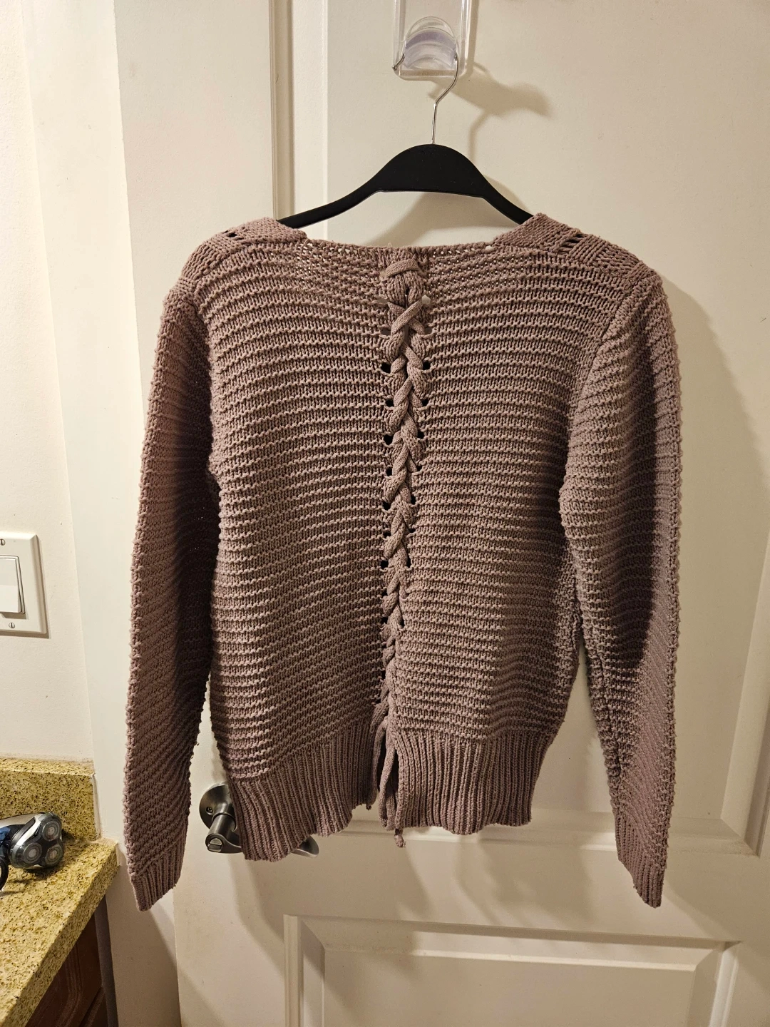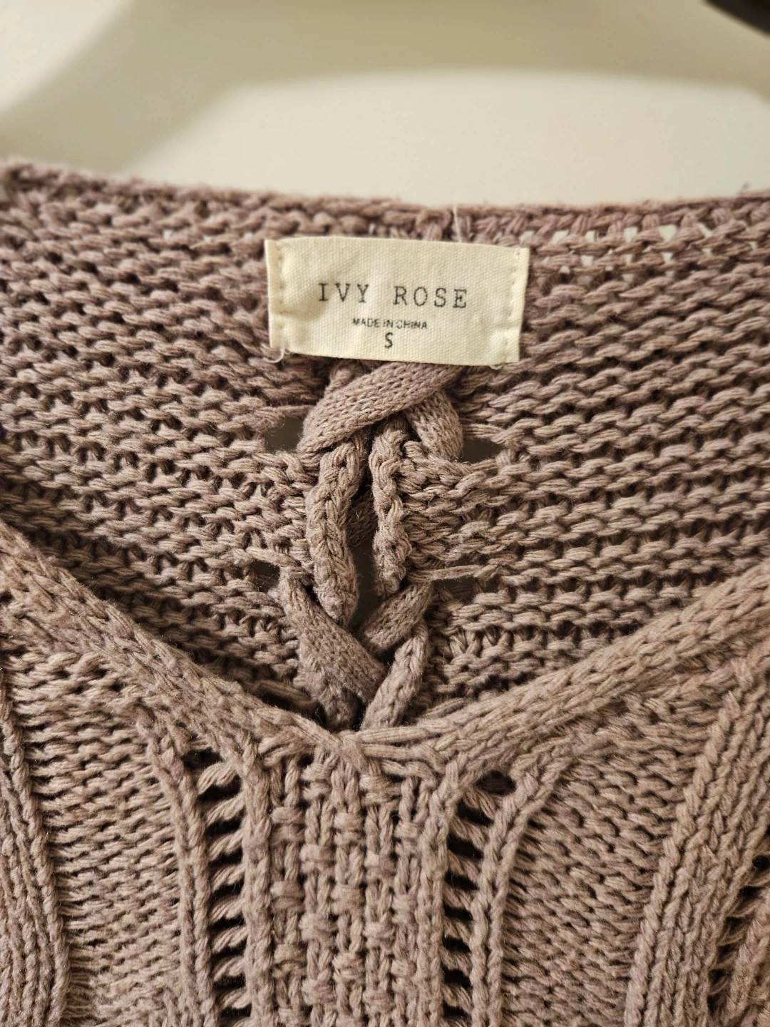 Selling a cute Ivy Rose knit sweater in size small. It's in great condition and features a unique braided design on the front and back. Perfect for layering or wearing on its own!