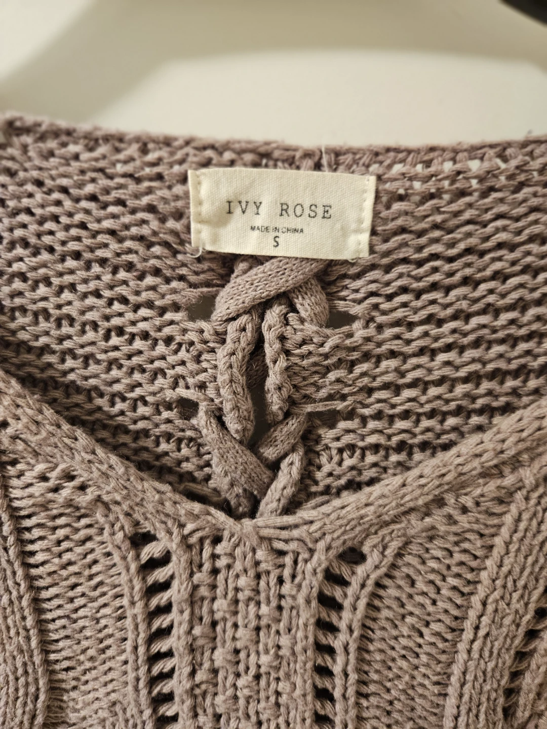 Selling a cute Ivy Rose knit sweater in size small. It's in great condition and features a unique braided design on the front and back. Perfect for layering or wearing on its own!