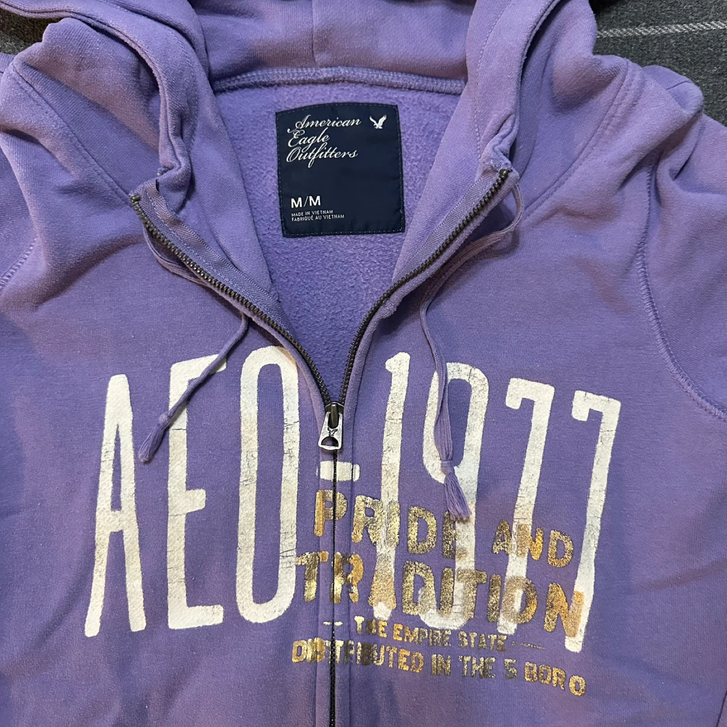 Check out this American Eagle Outfitters hoodie in a lovely shade of purple! It's a size M and features a full zip. Great for layering or just cozying up on a cool day