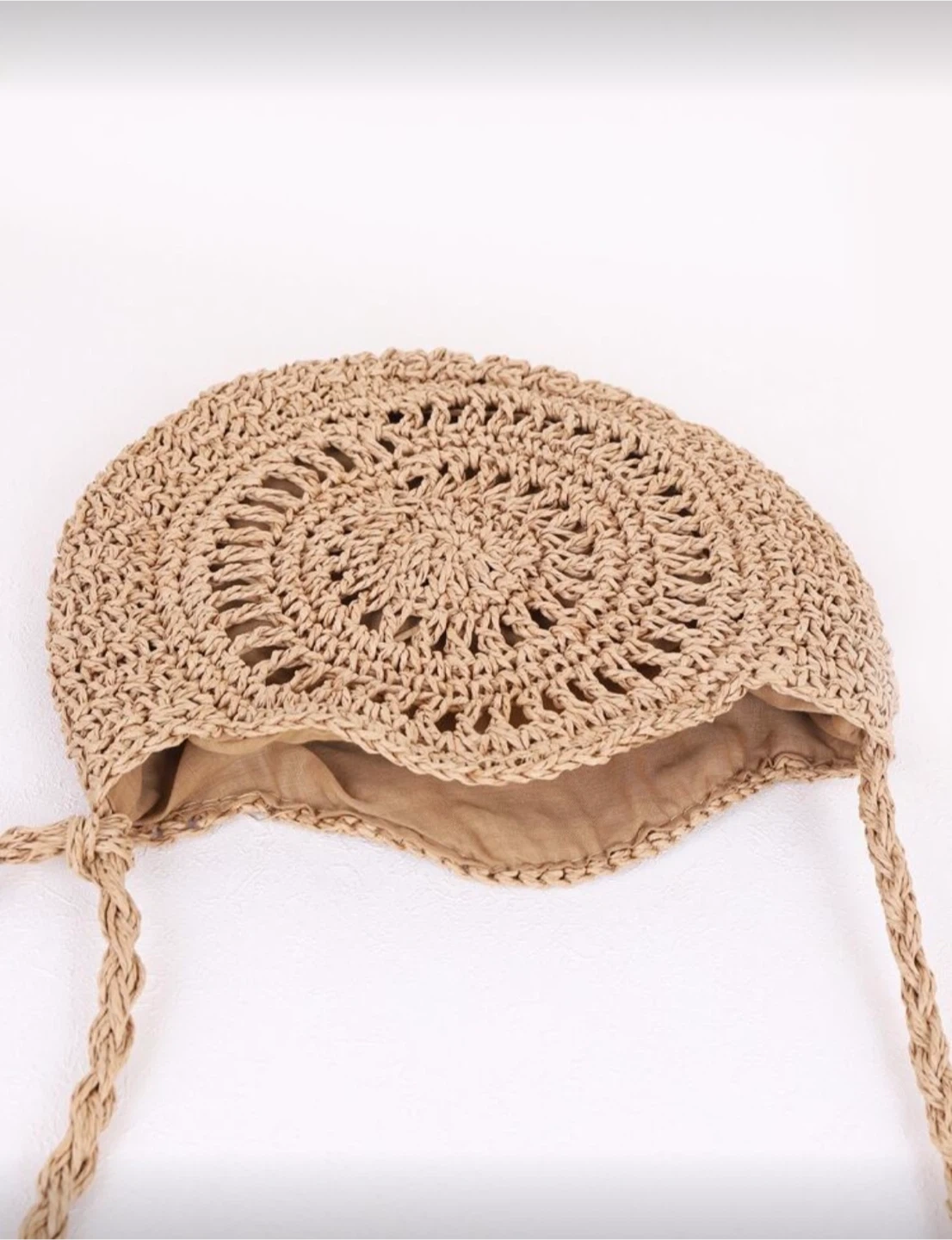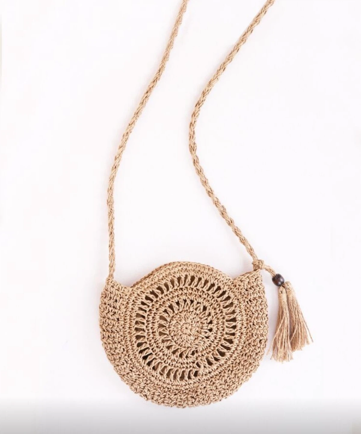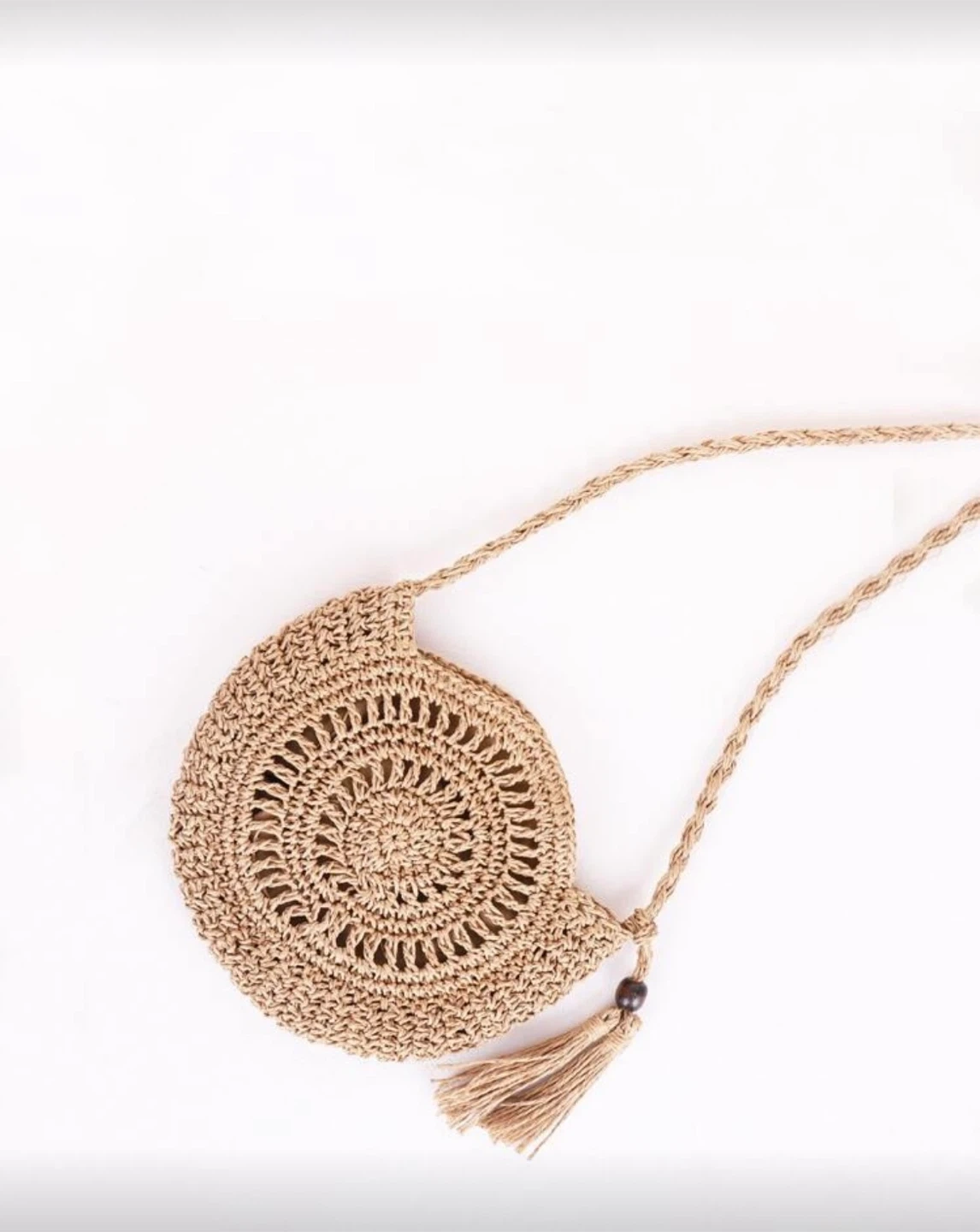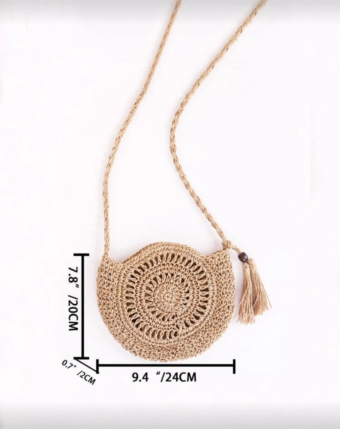 Selling a cute round woven straw shoulder bag. It's in great condition and perfect for summer outings! The bag features a unique circular design with a tassel detail. The dimensions are approximately 9.4"/24cm wide and 7.8"/20cm tall.