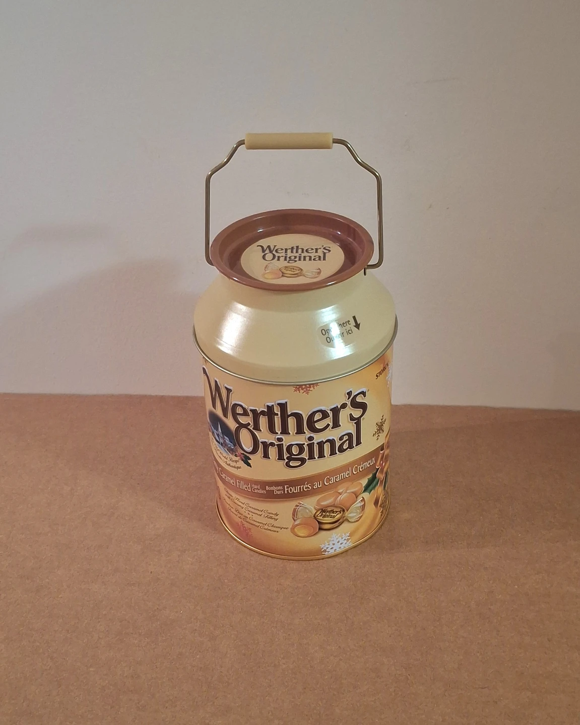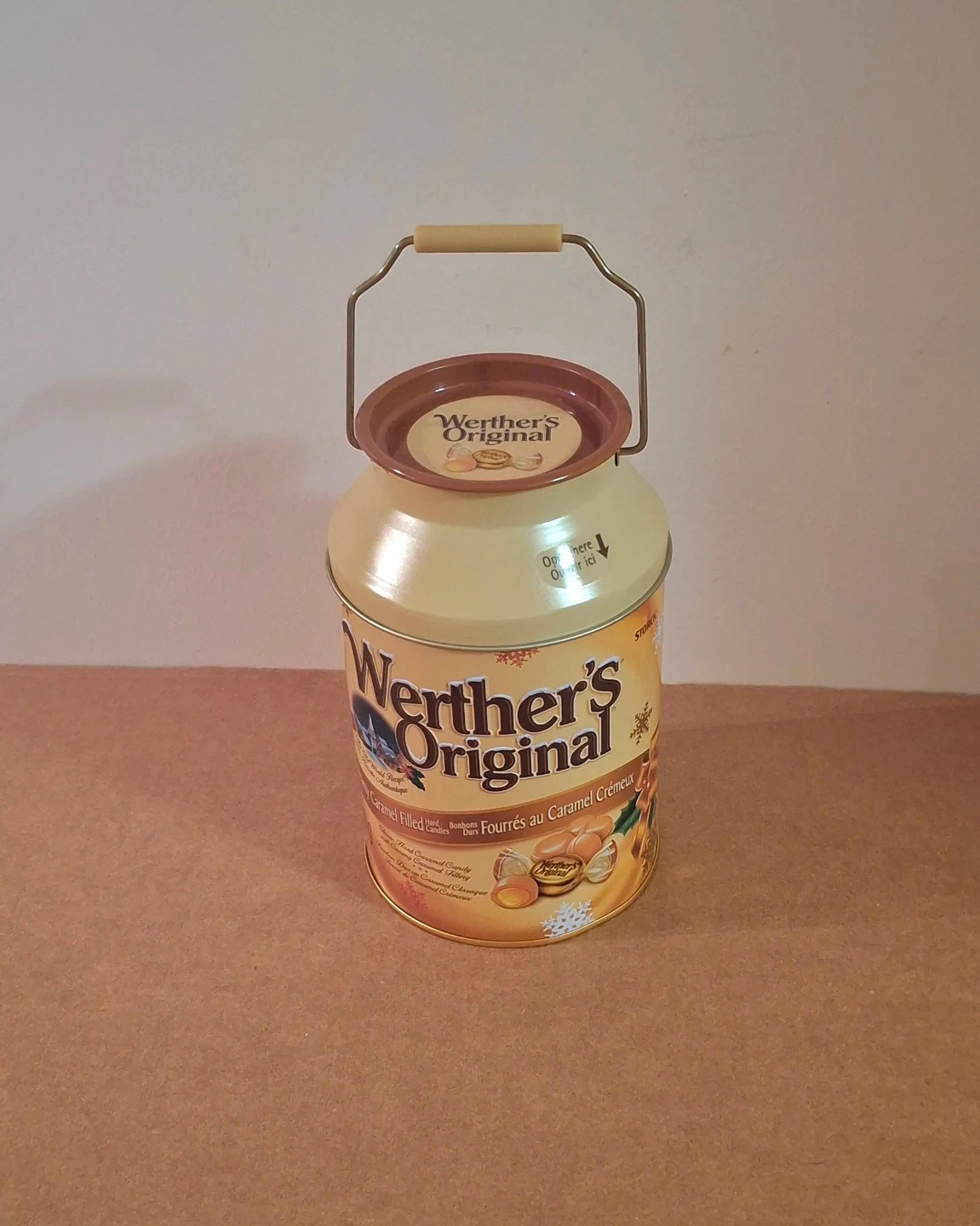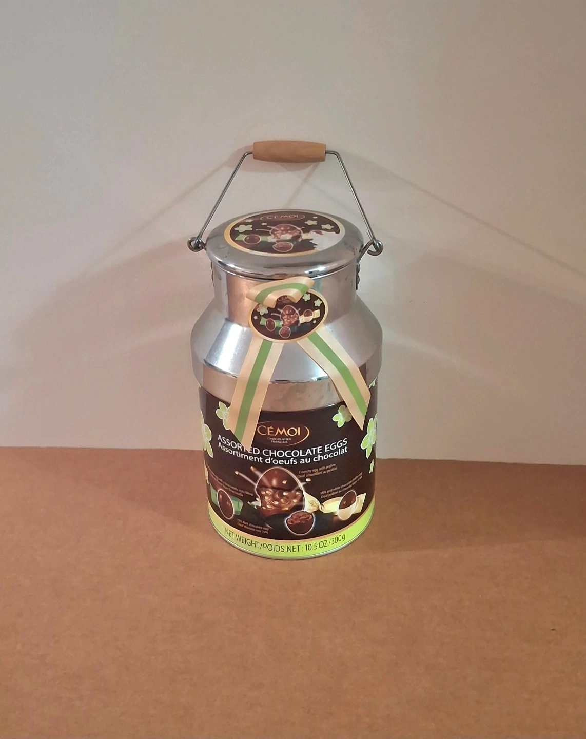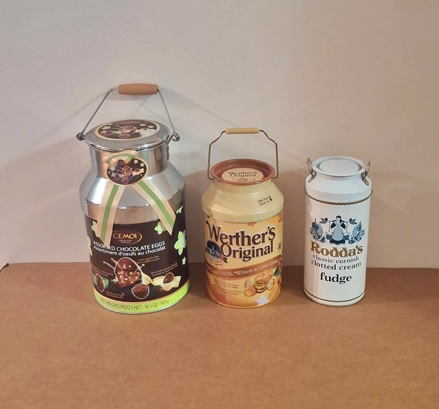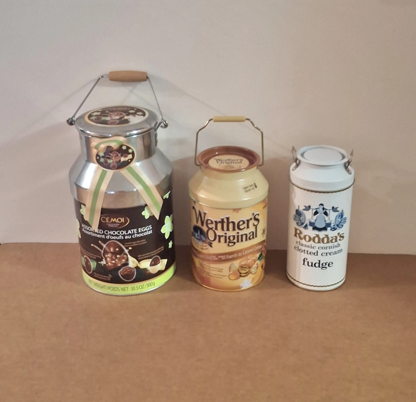 Three beautiful, lightly used, empty candy tins shaped like old-fashioned milk cans with handles, for just $6 each.