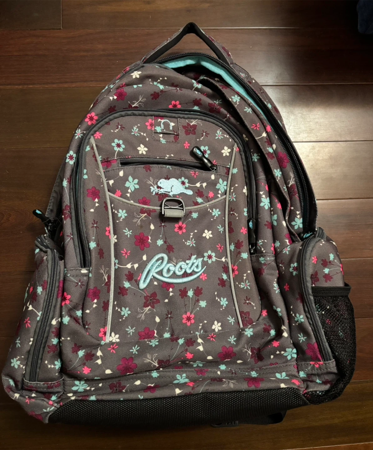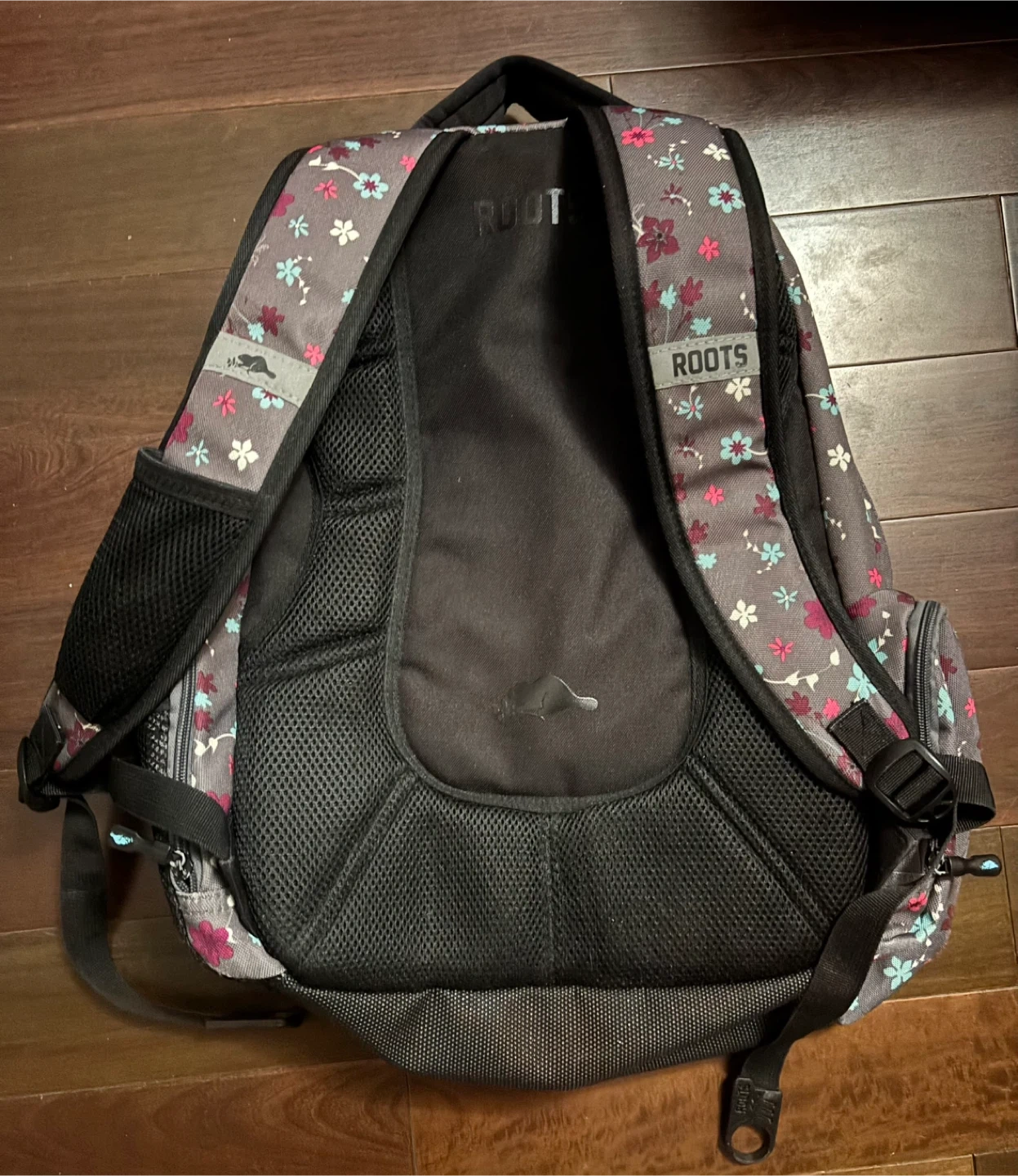 Roots backpack with a floral pattern! It's in great condition and for adults or kids to use. It has an interior padded pocket for a tablet.