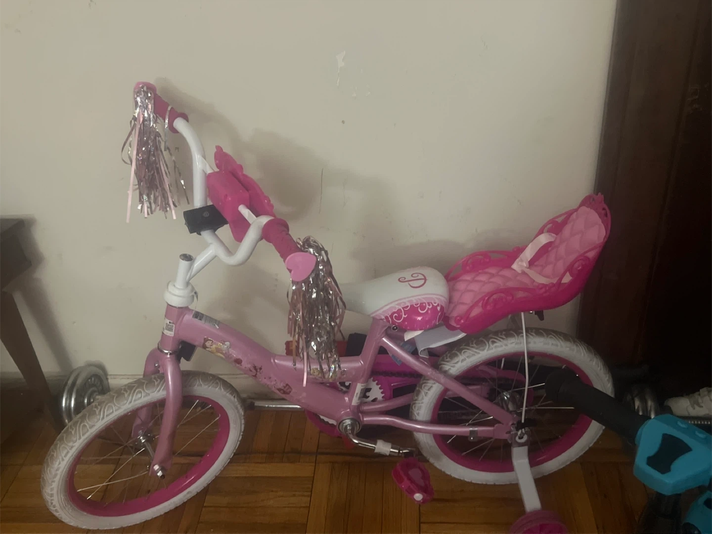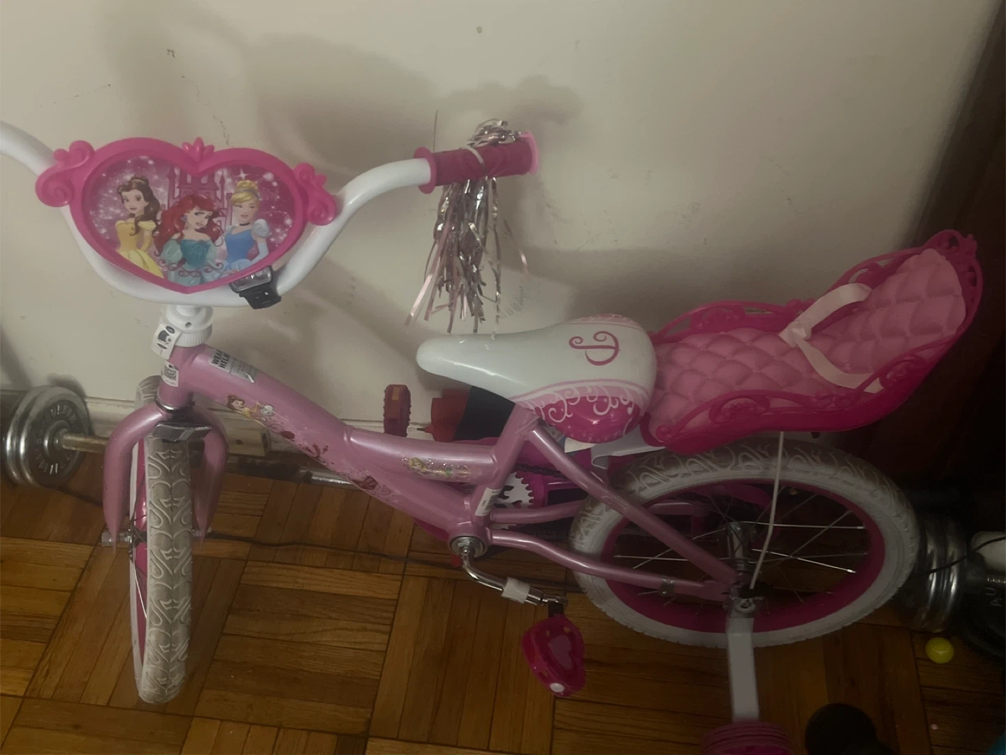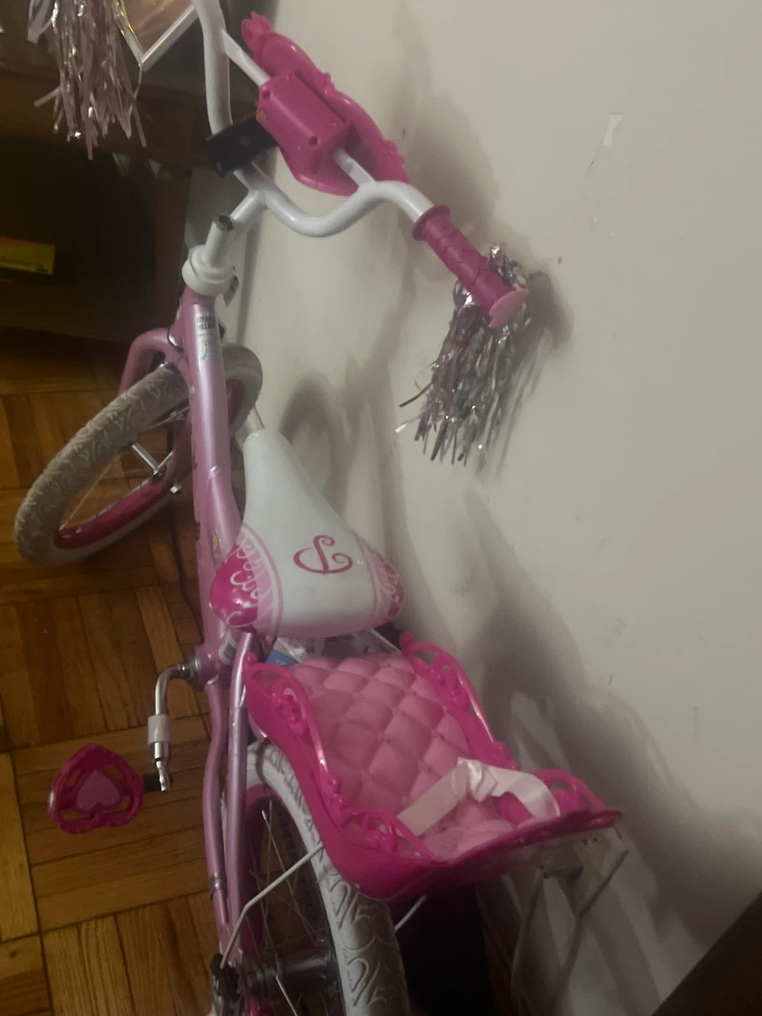 Selling a cute pink girls' bike. It has a princess design on the handlebars and frame. It also has a seat in the back for a doll or stuffed animal
