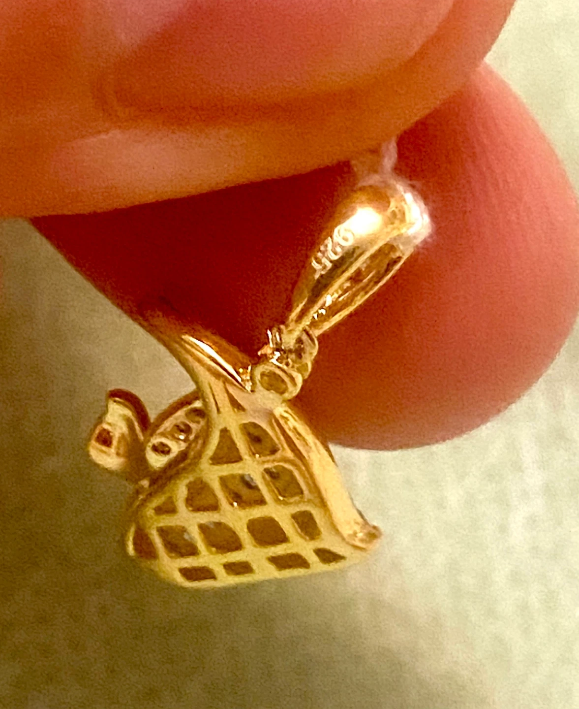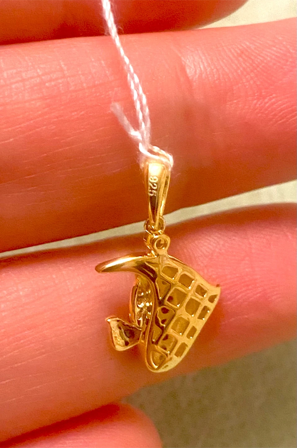 Selling a charming gold fish pendant. It features lovely gemstones that add a touch of sparkle. The pendant is marked '925', Sterling Silver. A unique and eye-catching piece!