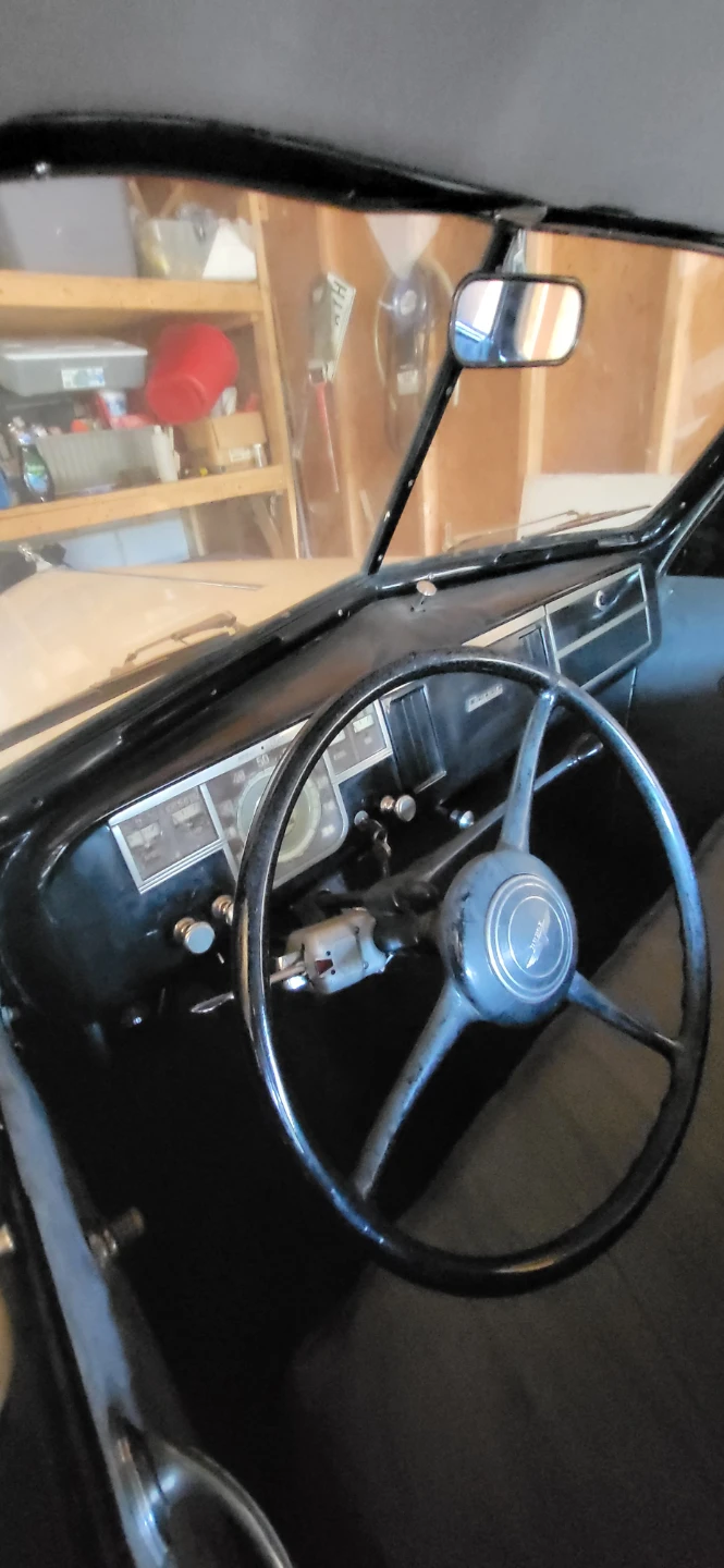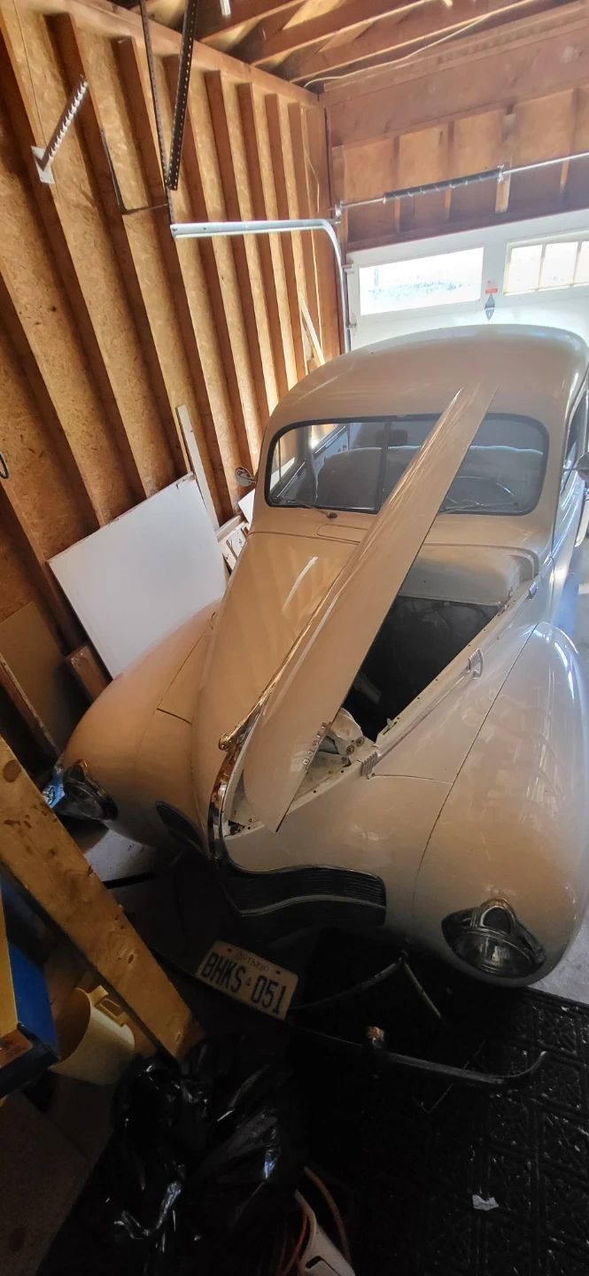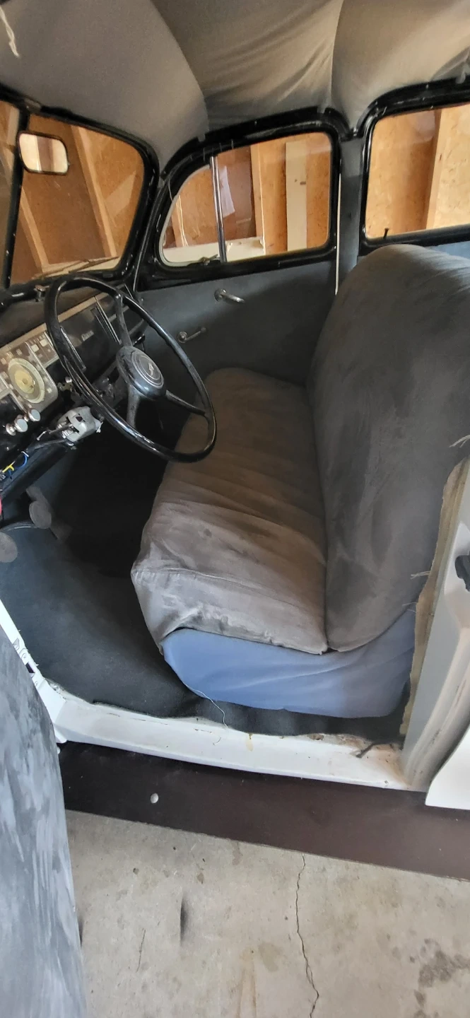 Selling a vintage sedan car. It appears to be white and in need of some TLC. The interior features a grey bench seat and a classic steering wheel. A great project for a car enthusiast!