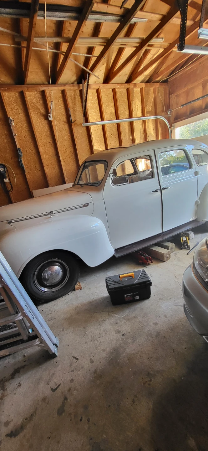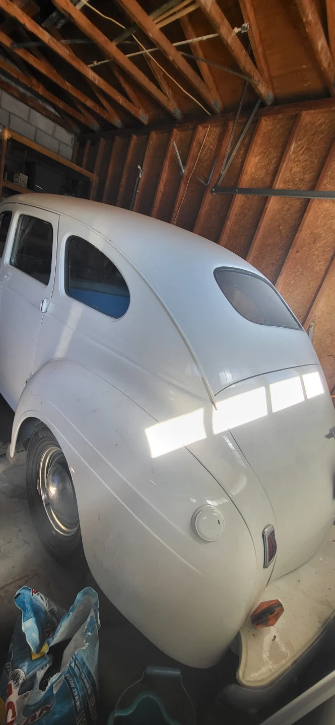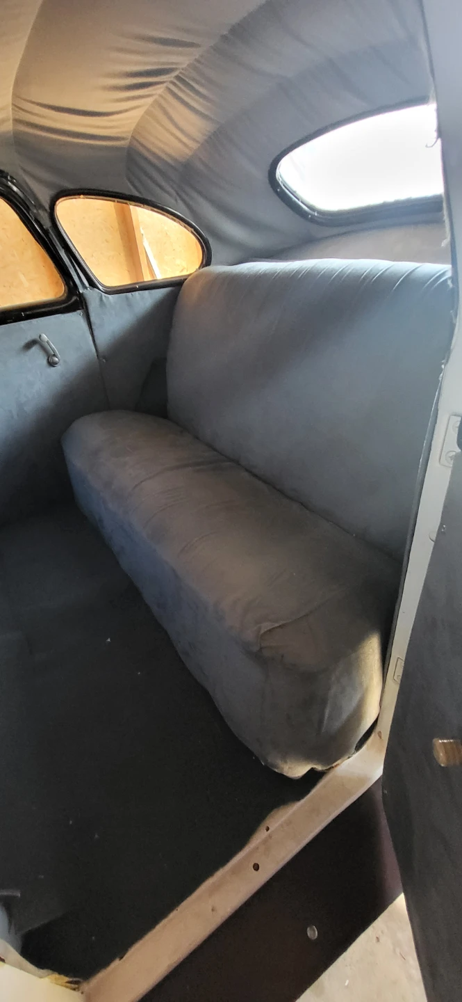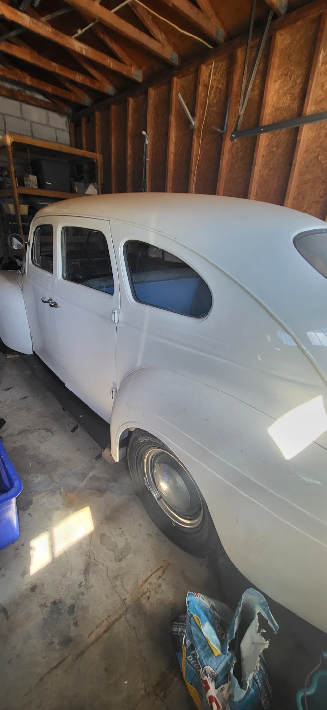 Selling a vintage sedan car. It appears to be white and in need of some TLC. The interior features a grey bench seat and a classic steering wheel. A great project for a car enthusiast!
