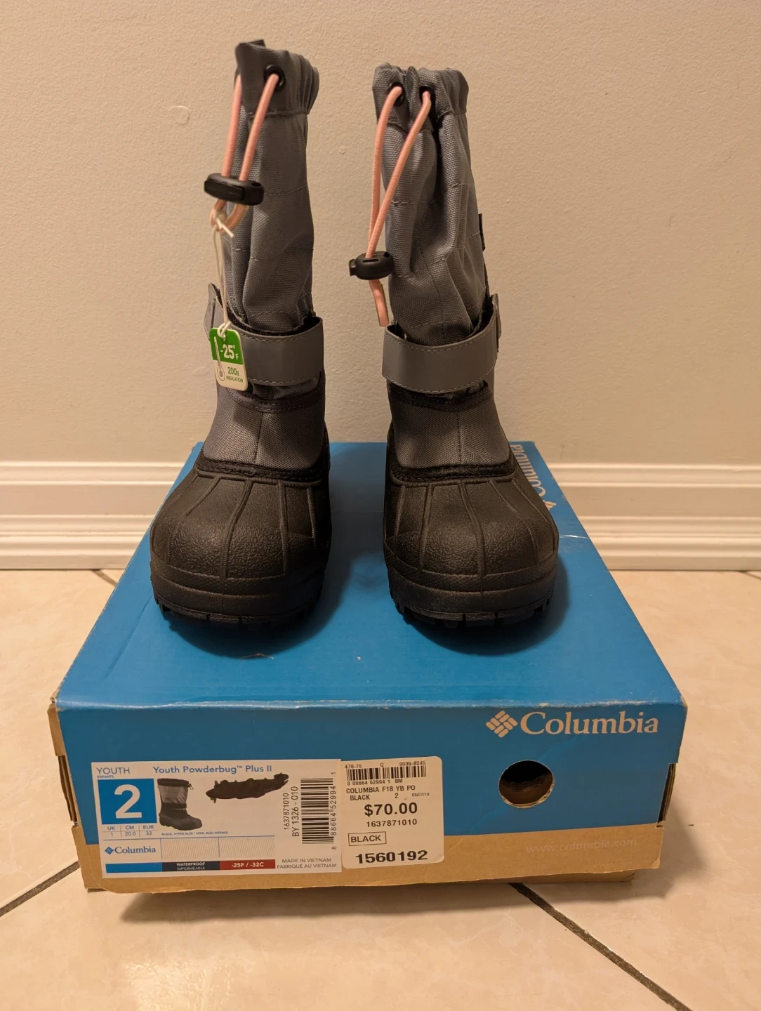 These Columbia Youth Powderbug Plus II boots are brand new and ready for snowy adventures! They come in their original box and are a size 2. The colour is Grey Ash/Black. Perfect for keeping little feet warm and dry!