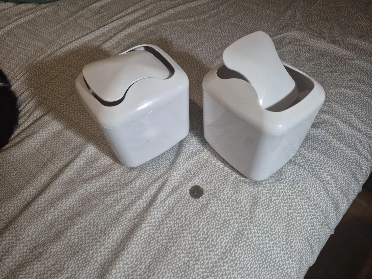 Selling a set of two mini white trash cans! They're in great condition and perfect for small spaces or desks. They don't take up too much room and are easy to clean.