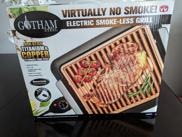 Gotham Steel Smokeless Indoor Grill in very Good condition! Nonstick Indoor Smokeless Grill with Ceramic Coating & Adjustable Heating, Indoor Grill Electric Smokeless with Dishwasher Safe Removable Grill Plate, Toxin Free. Enjoy your favorite grilled foods anytime you want with the Gotham Steel Indoor Smokeless Grill inside the house– think grilled steak, bacon, fish, kabobs, pork chops, burgers, chicken and more to perfection, year-round– just plug in, adjust the heat and you are ready to go! SMOKE-LESS TECHNOLOGY - this indoor smokeless grill has a mindfully designed drip tray which cools all grease quickly and reduces virtually all hot smoke, allowing you to grill all your food indoors without the smell of smoke polluting your apartment or home.