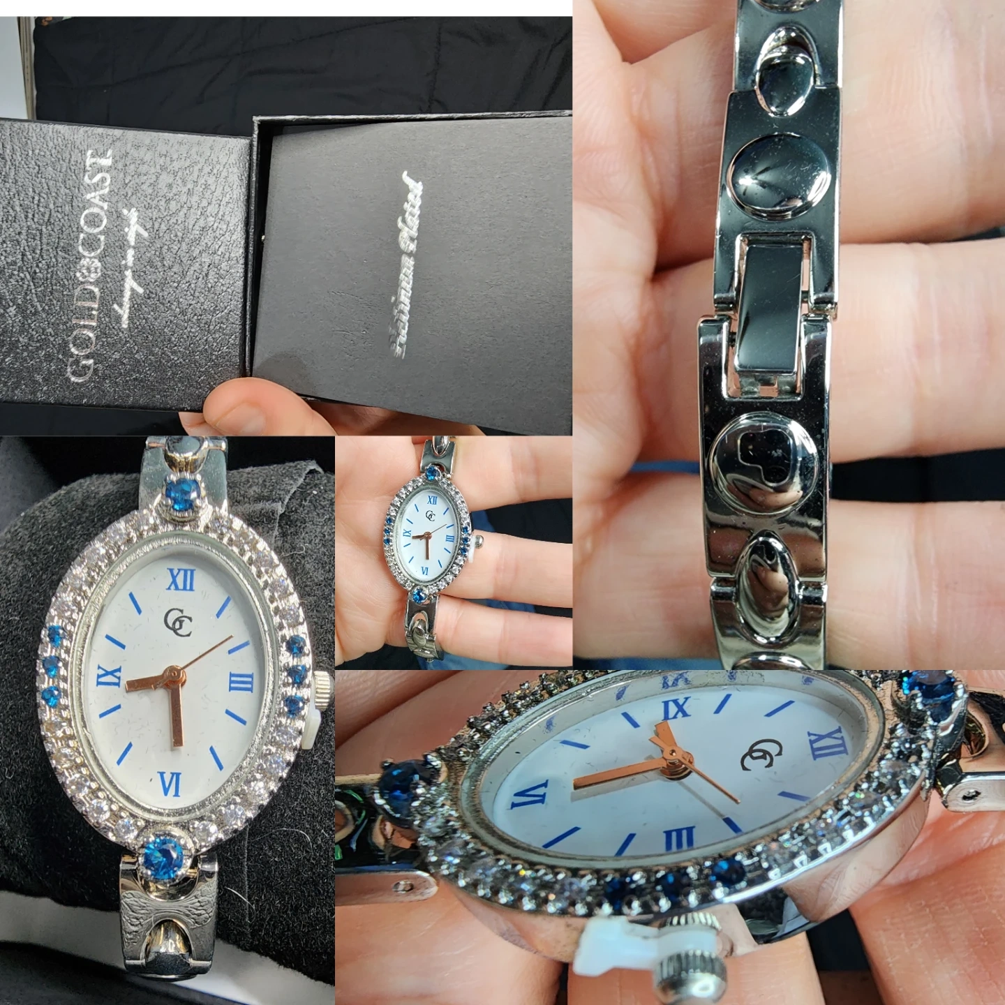Selling a Gold Coast ladies' watch with a silver-tone band and an oval face. It features blue and clear stones around the bezel. Comes with the original box!