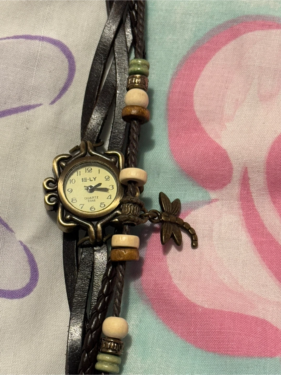 This is a cute watch with a braided leather strap and a dragonfly charm. It has a vintage-inspired look with its bronze-tone face and wooden beads. The band is dark brown and adjustable. Needs a new battery