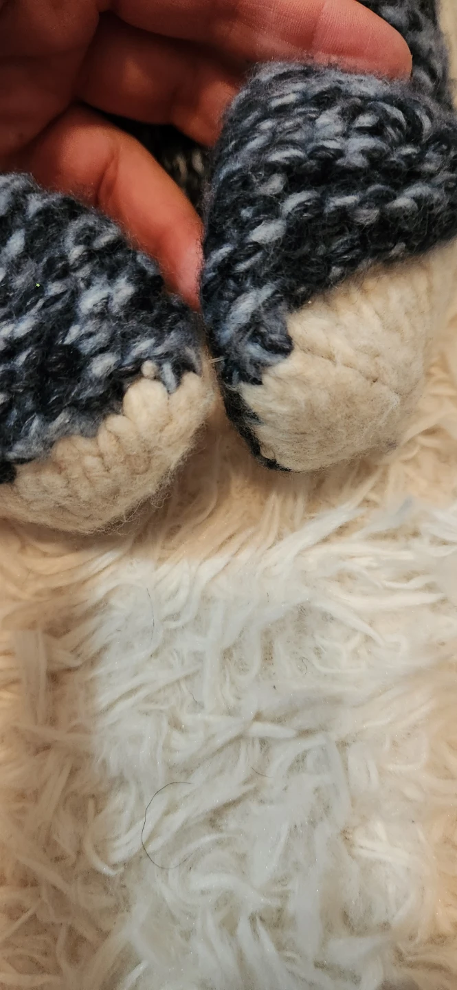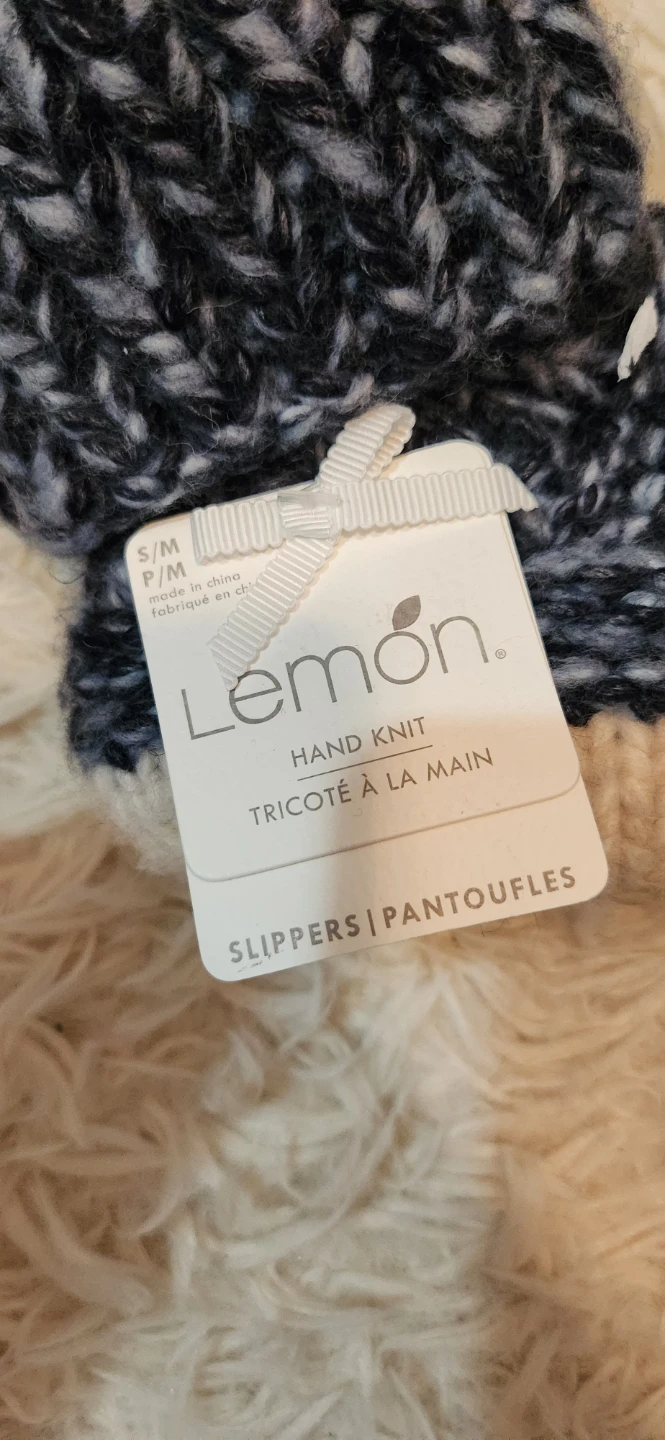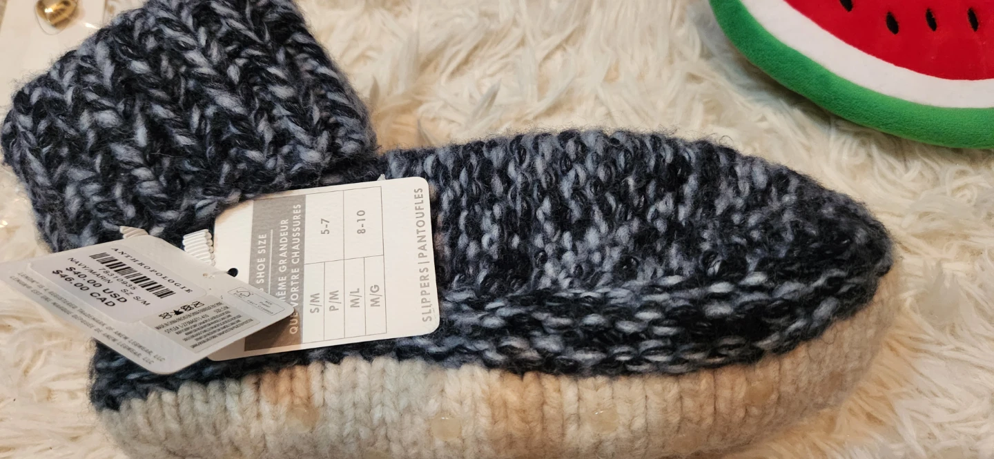 These hand knit slippers are super cozy! They're a size S/M and in a lovely navy and cream colour. Perfect for keeping your feet warm on chilly evenings