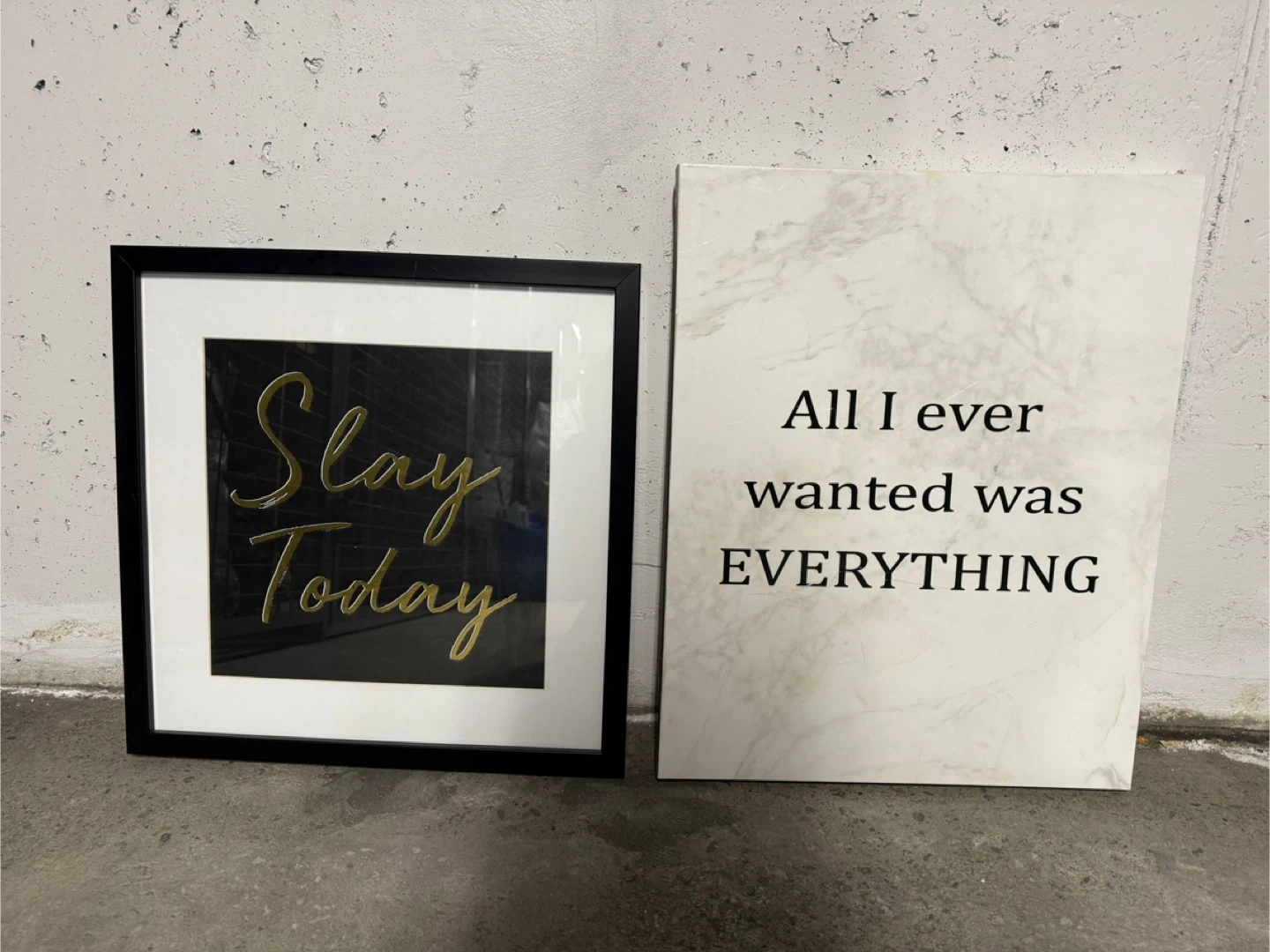 Selling two pieces of wall art! One is a framed print that says 'Slay Today' in gold lettering. The other is a marble-look print that says 'All I ever wanted was EVERYTHING'. Both are in great condition and ready to add some personality to your space.
