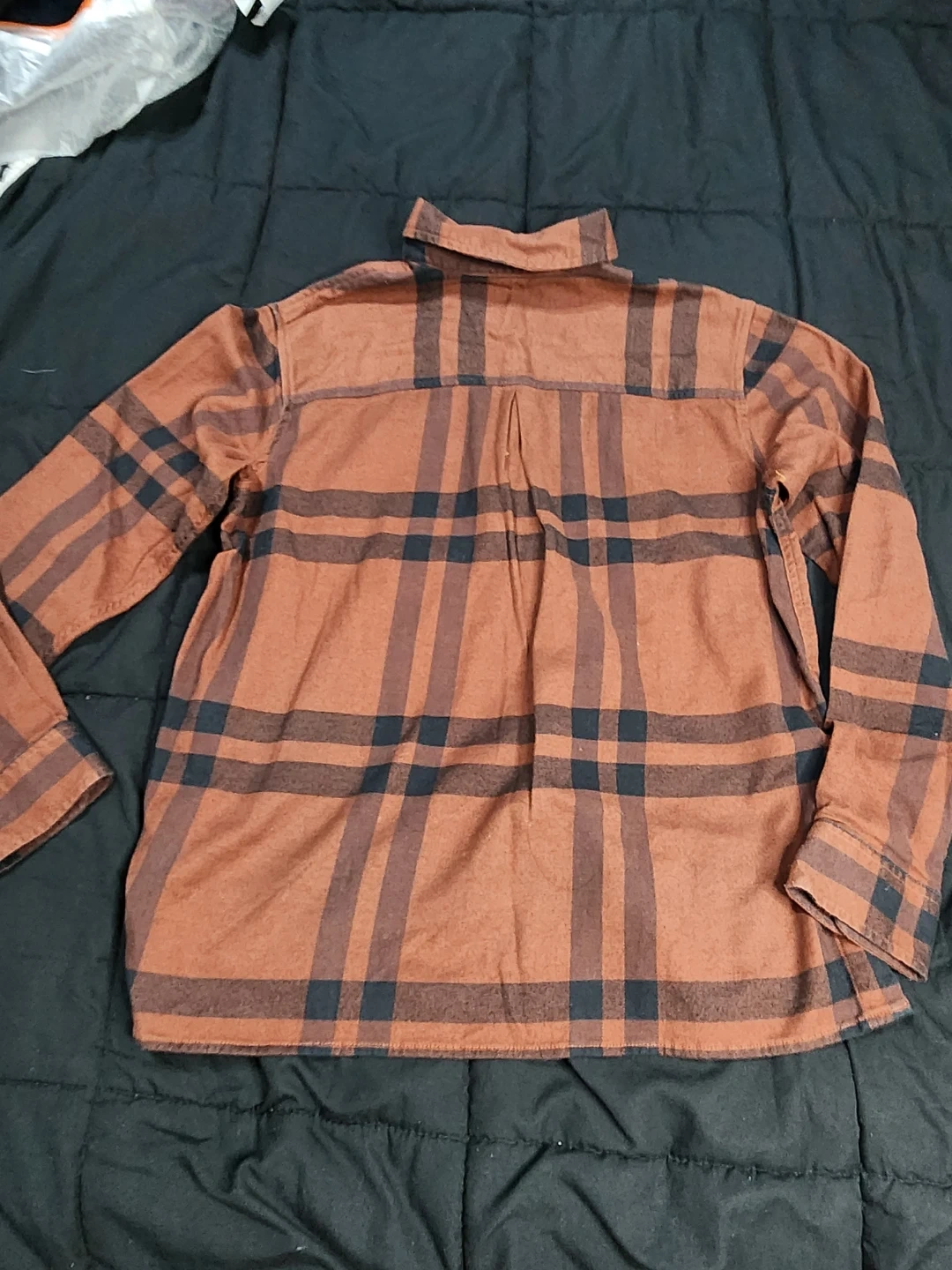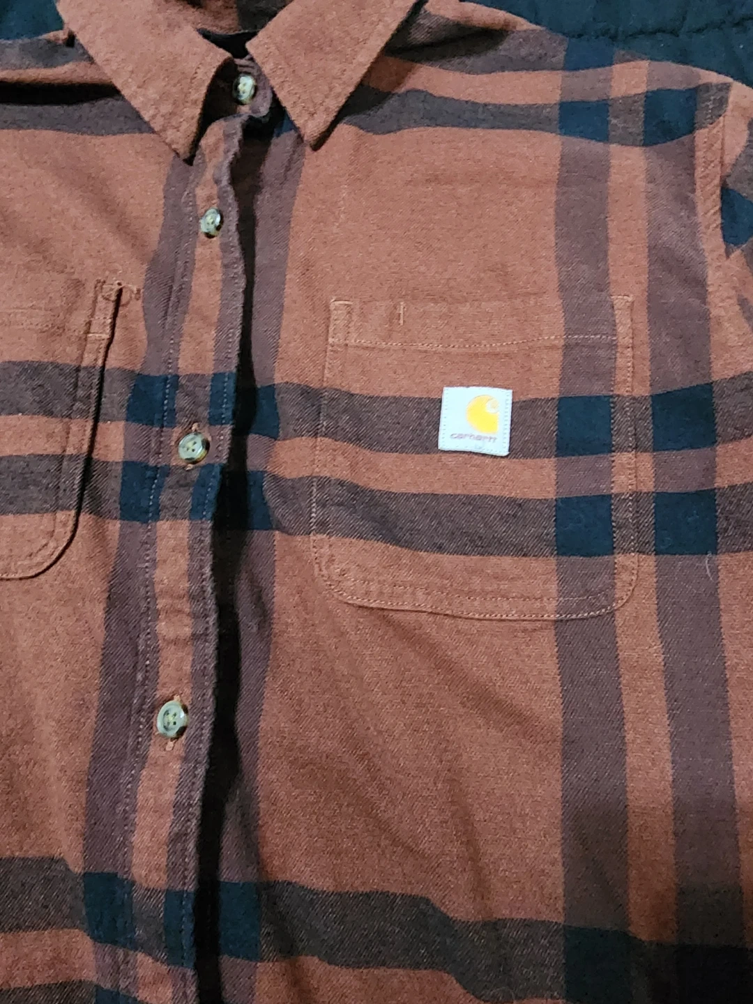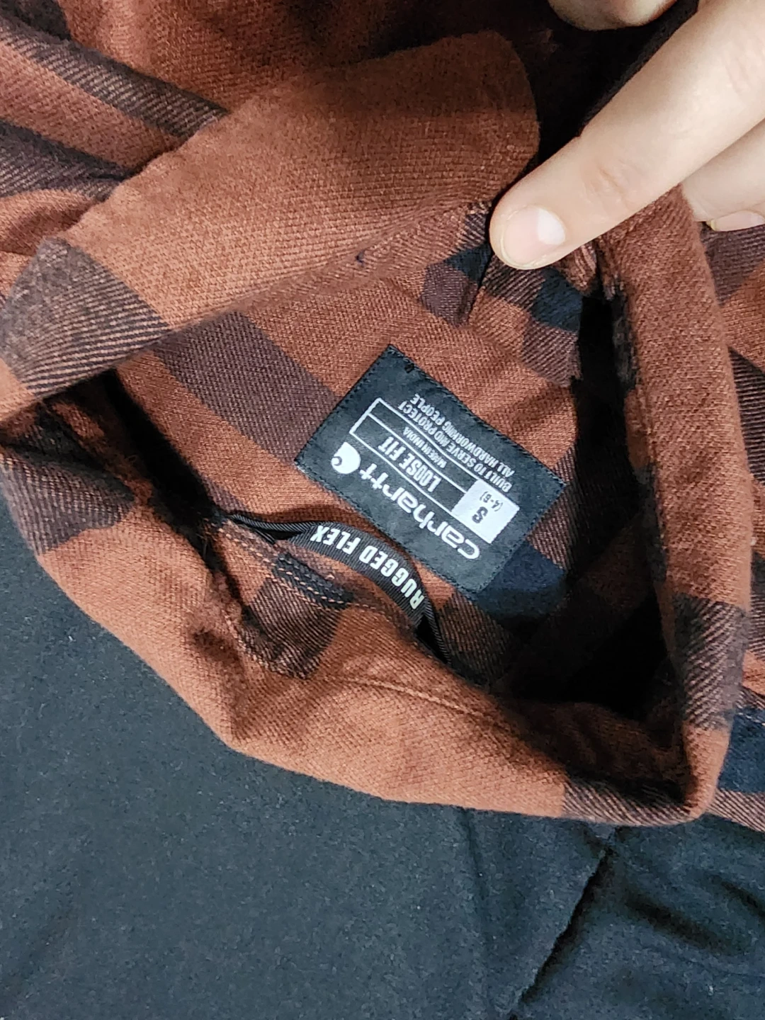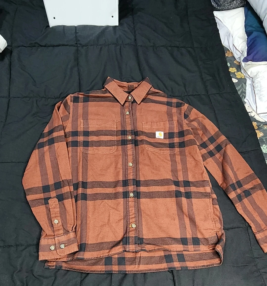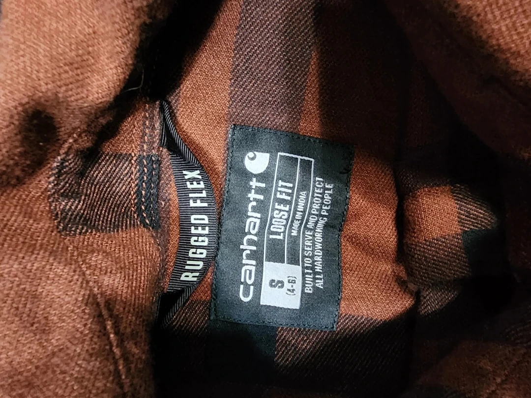 Here's a Carhartt Rugged Flex Loose Fit flannel shirt! It's a size small and features a brown and black plaid pattern. Perfect for layering or wearing on its own