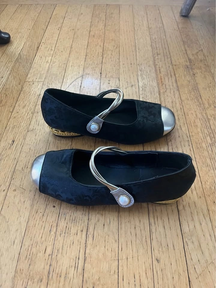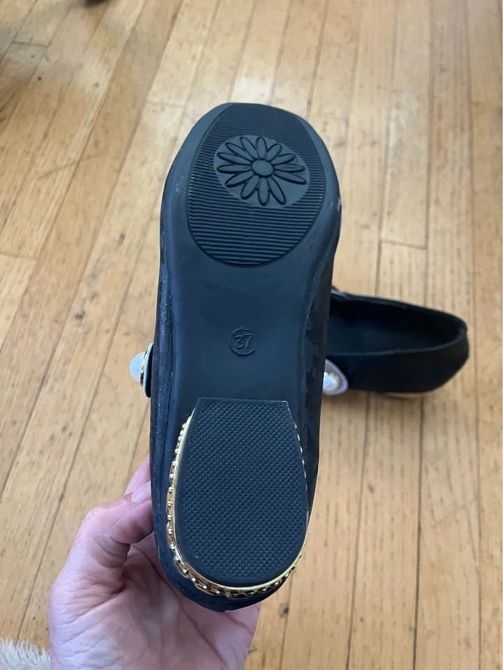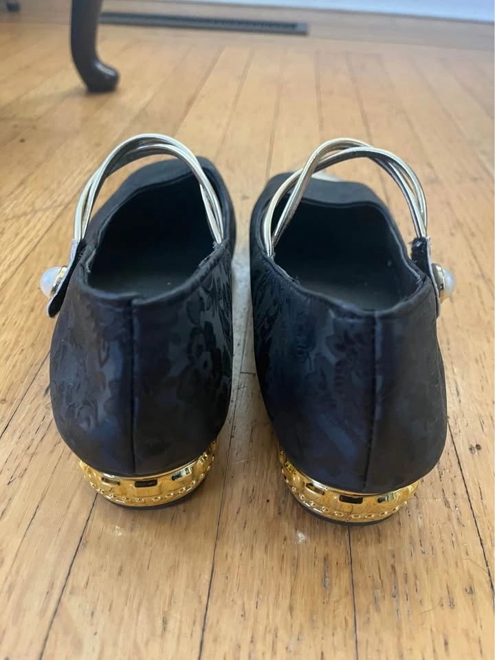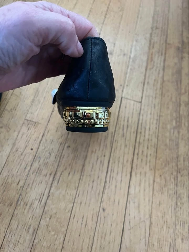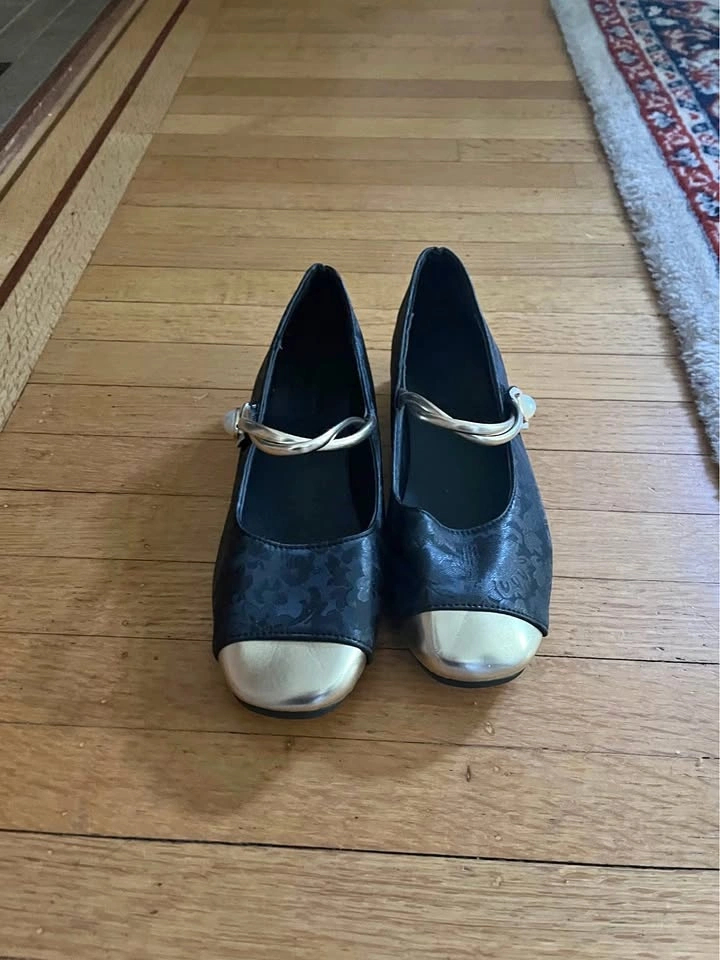 New, never worn dress shoes. Low heel, black pleather with gold accents. Perfect for a night out. Size 37.
