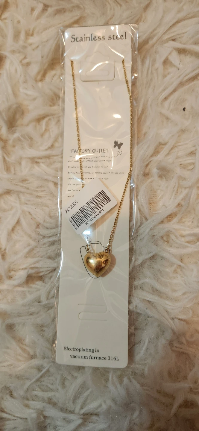 I'm selling a brand new stainless steel necklace! It's gold in colour and features a cute heart pendant. The necklace is still in its original packaging.