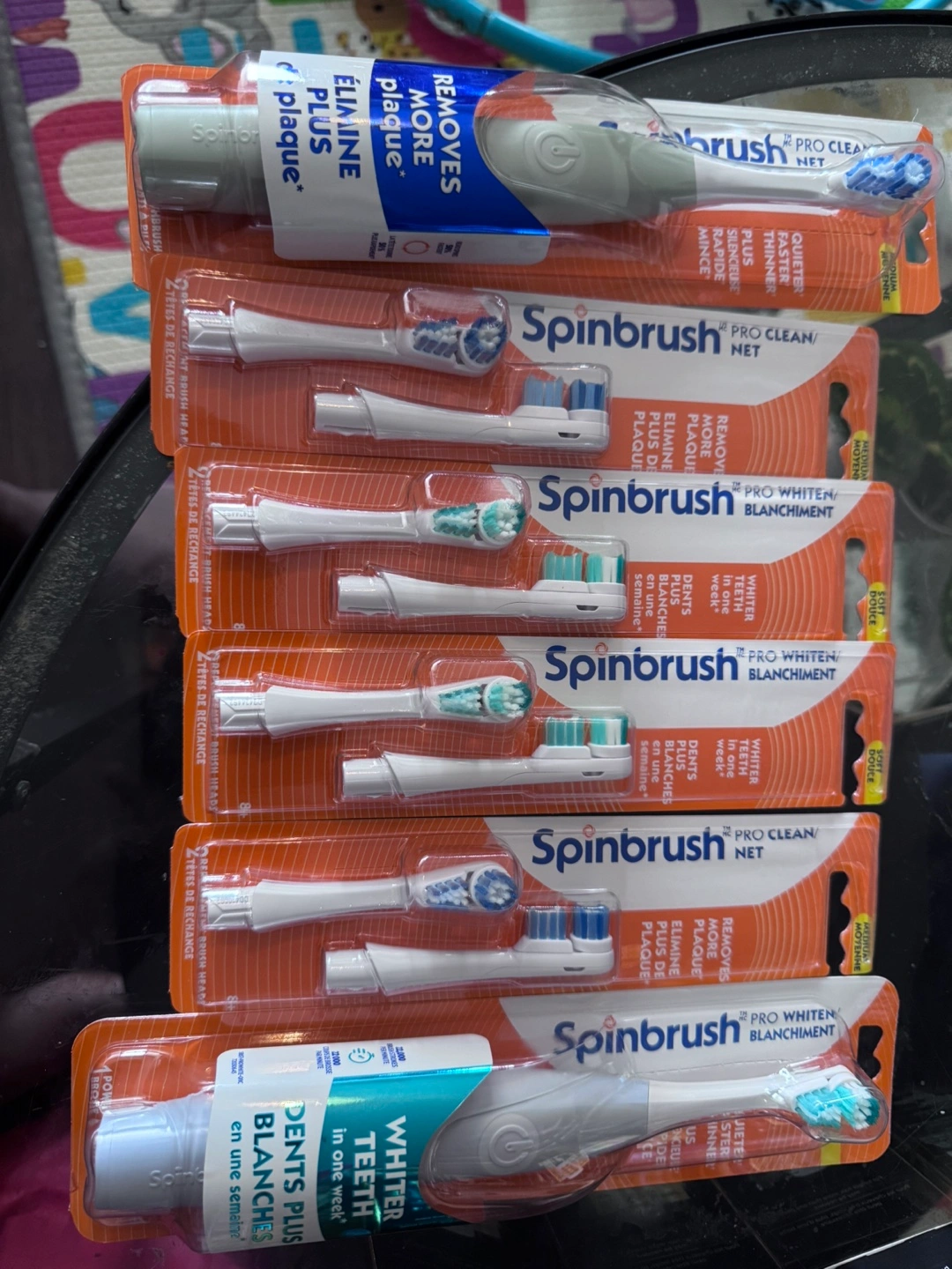 I have a mix of Spinbrush Pro Clean and Pro Whiten toothbrushes and replacement heads available. They help remove more plaque and whiten teeth in one week. Get a brighter, cleaner smile!
