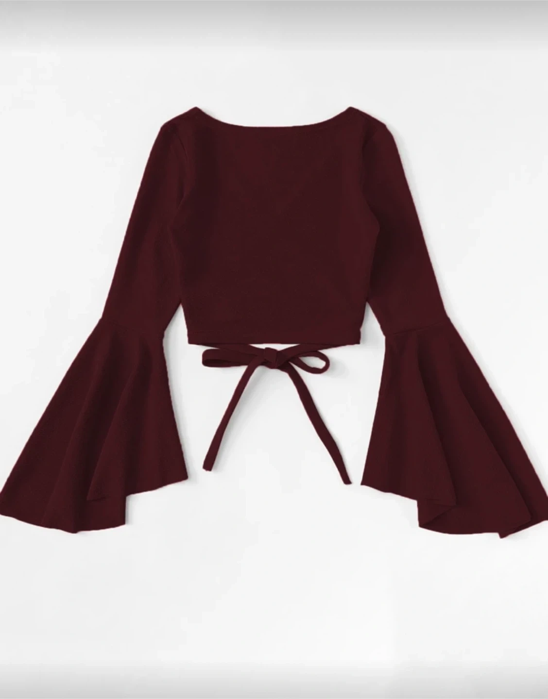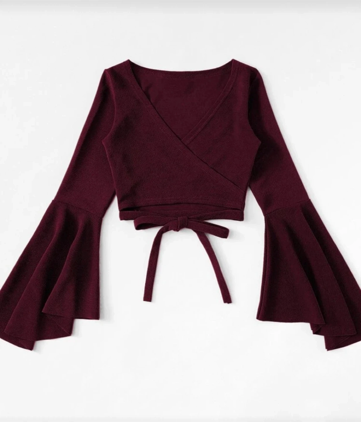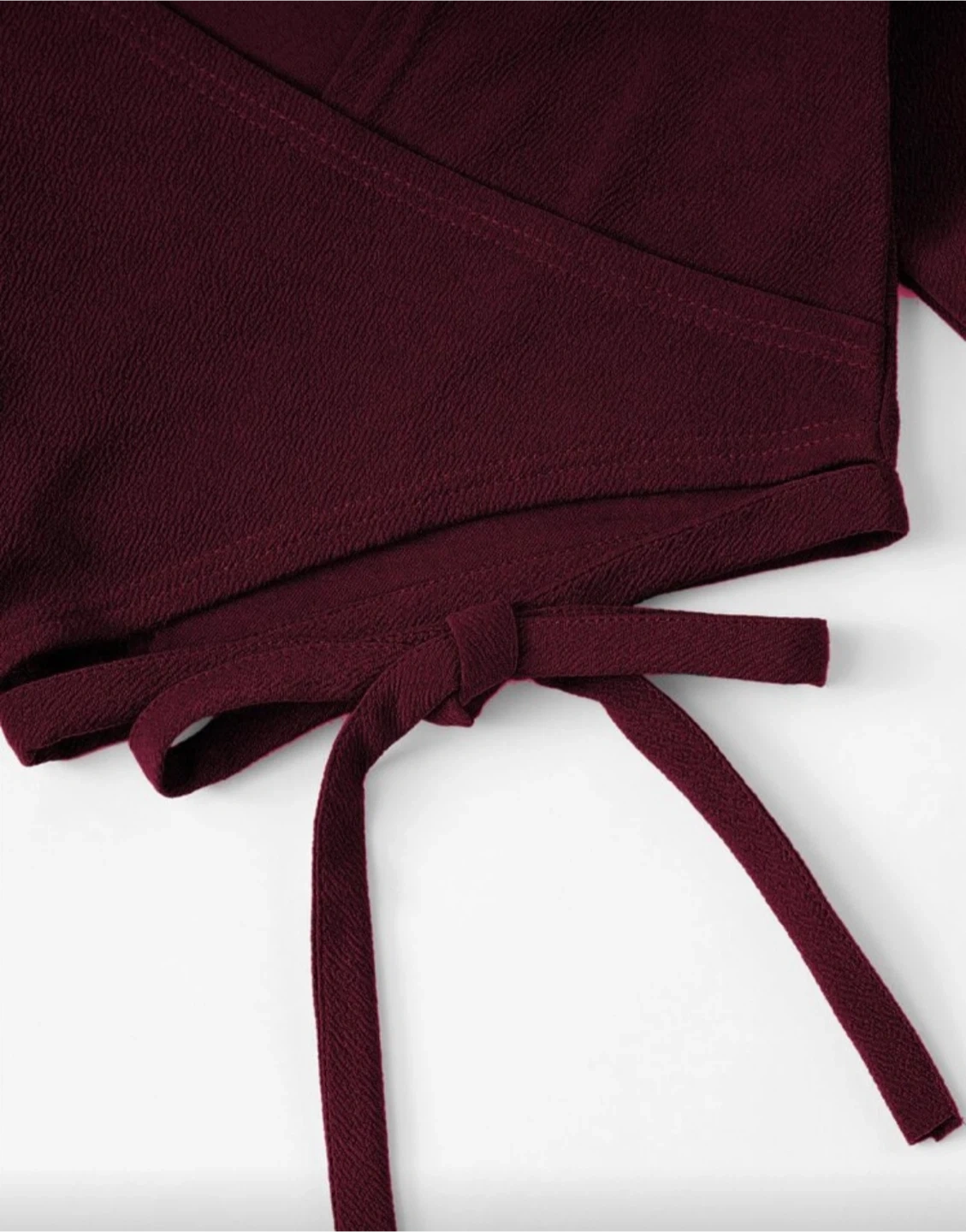 Here's a stylish burgundy long sleeve crop top! It features a flattering wrap design and a tie at the waist. Perfect for adding a touch of elegance to your outfit!