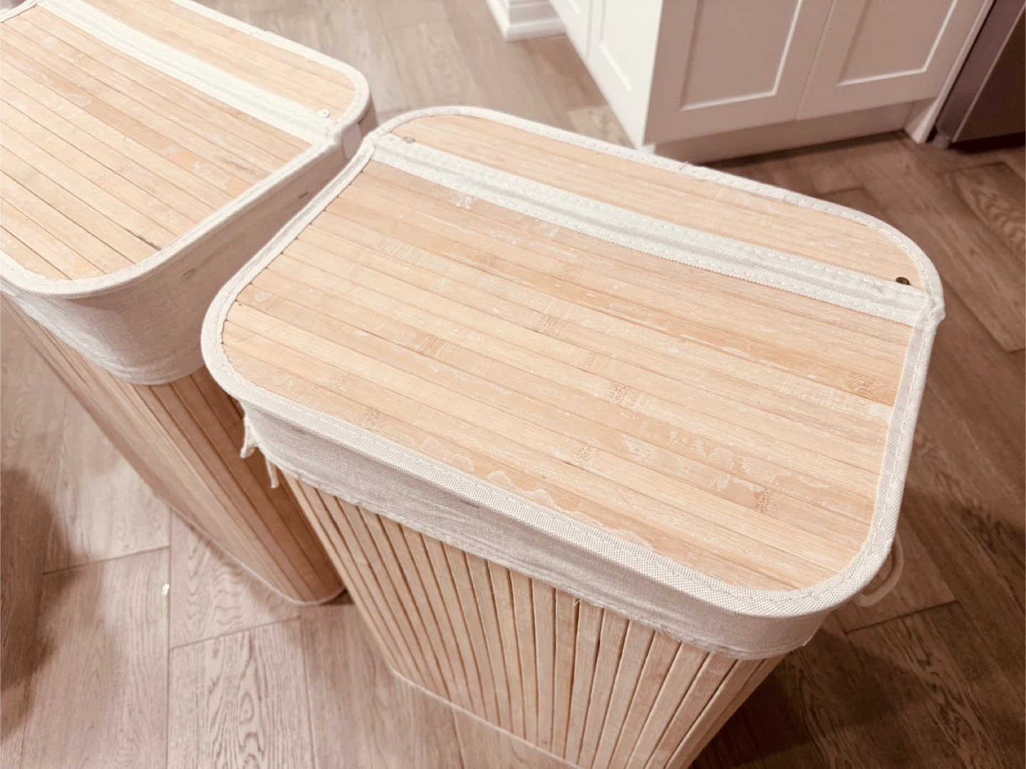 Selling a set of two bamboo laundry hampers! They come with lids and removable cloth liners. These hampers are in great condition and would be a lovely addition to any bathroom or bedroom
