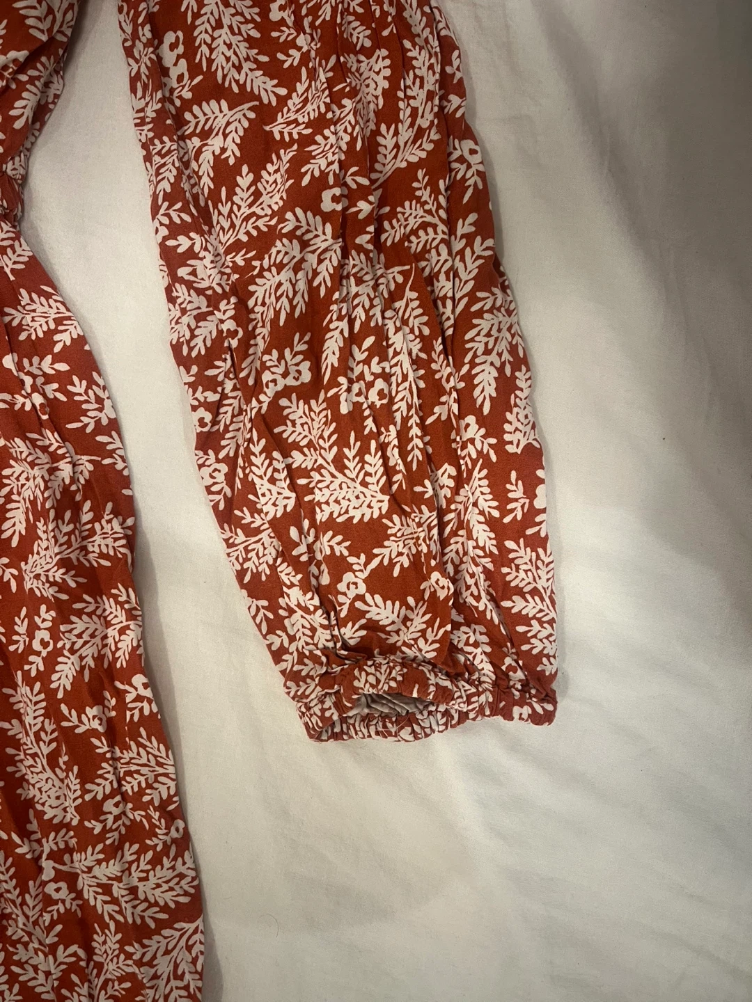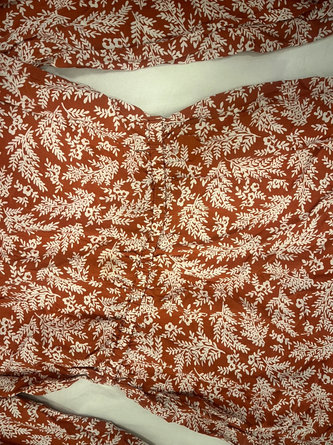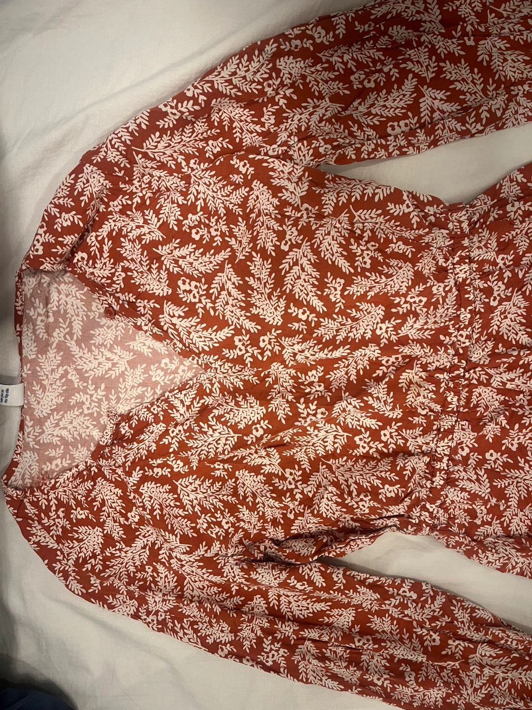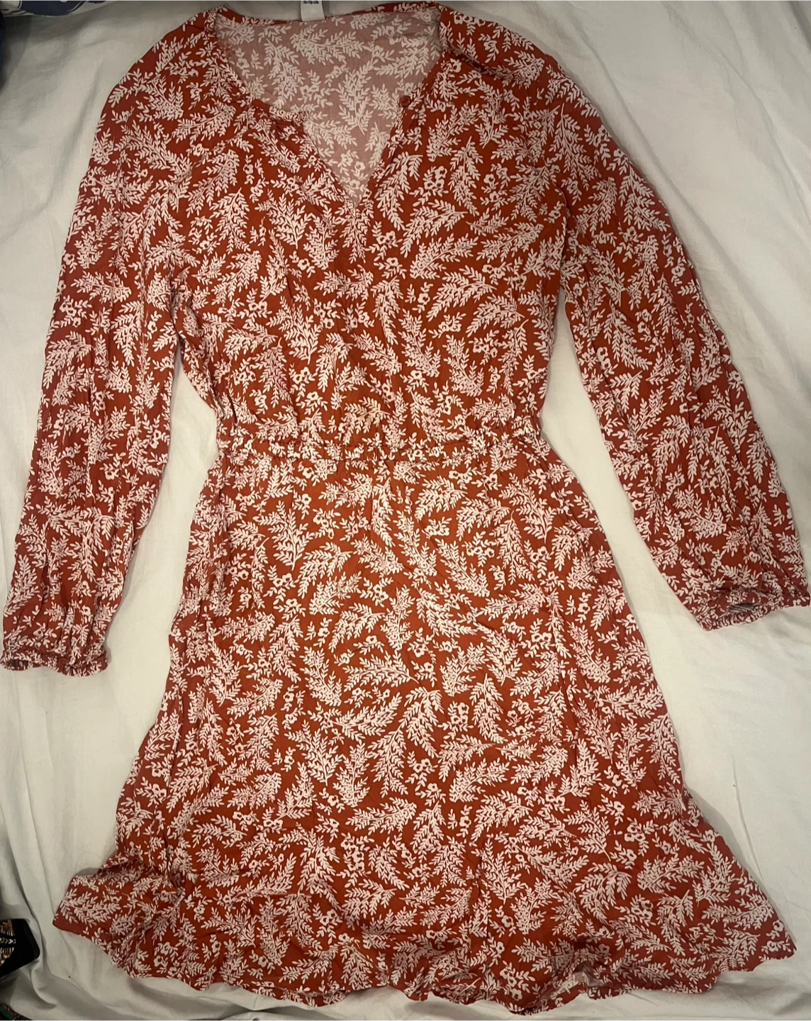 Cute floral print dress in a reddish-brown colour! It's an extra small but it will fit to Bust size 34B and features a v-neck and medium sleeves. Perfect for a casual day out or dressed up for an evening occasion.