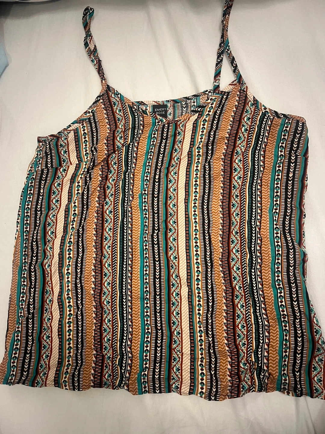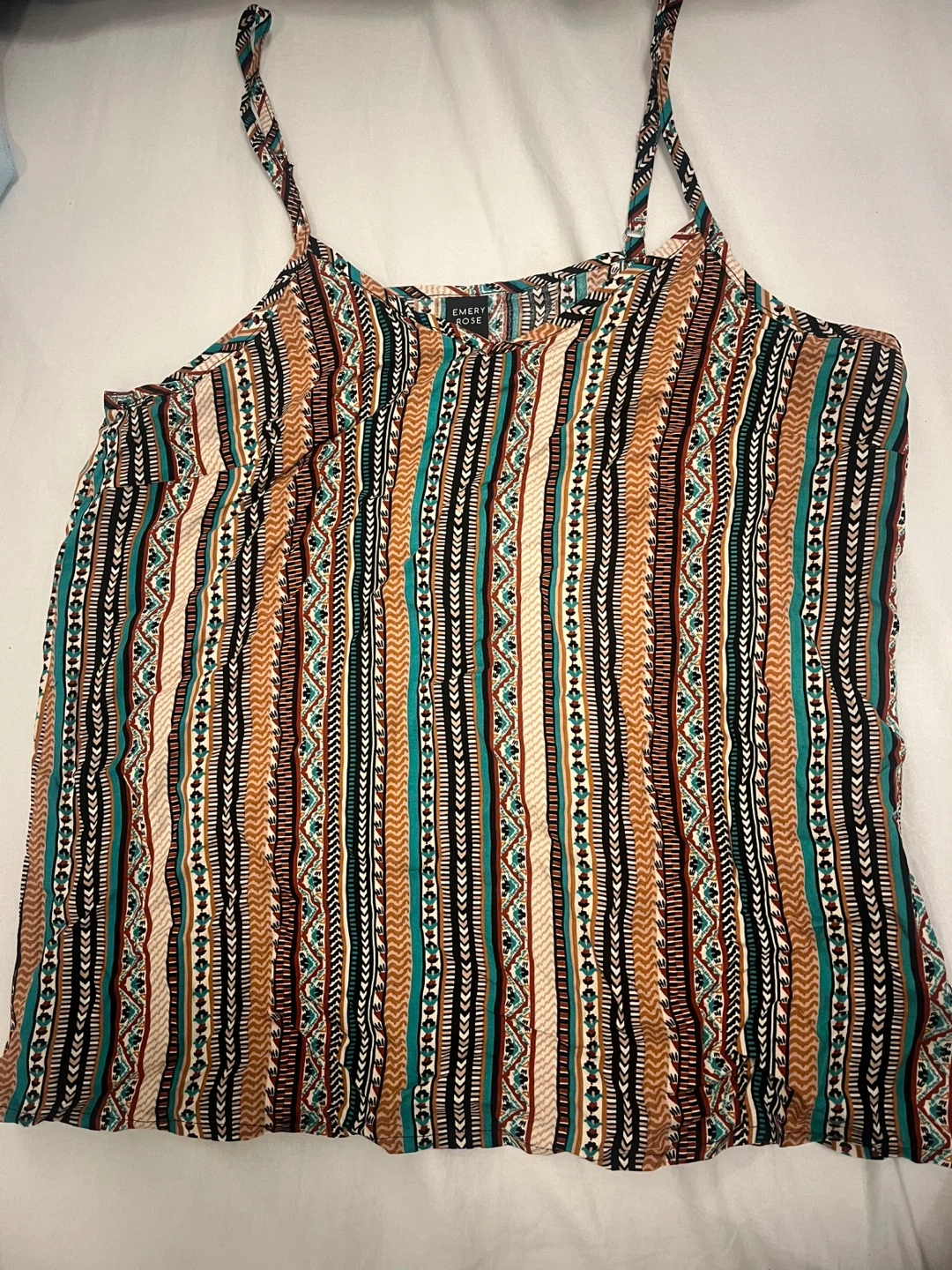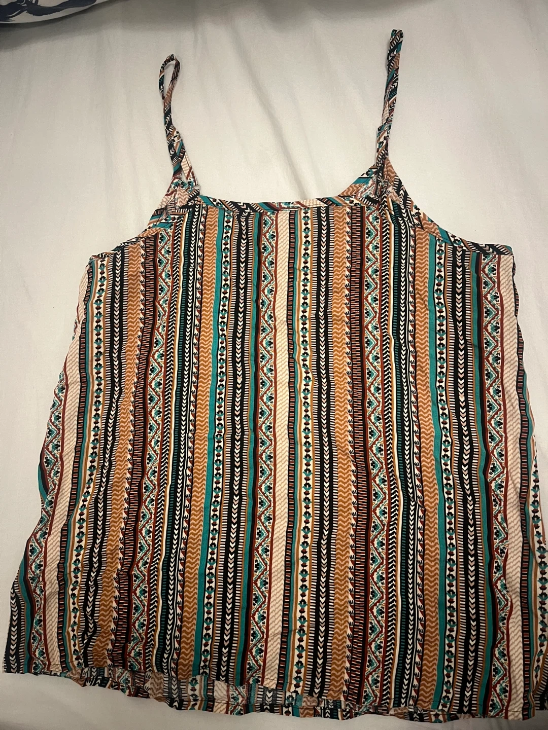 A spaghetti strap top with boho print size XS but will fit the bust size 34B.