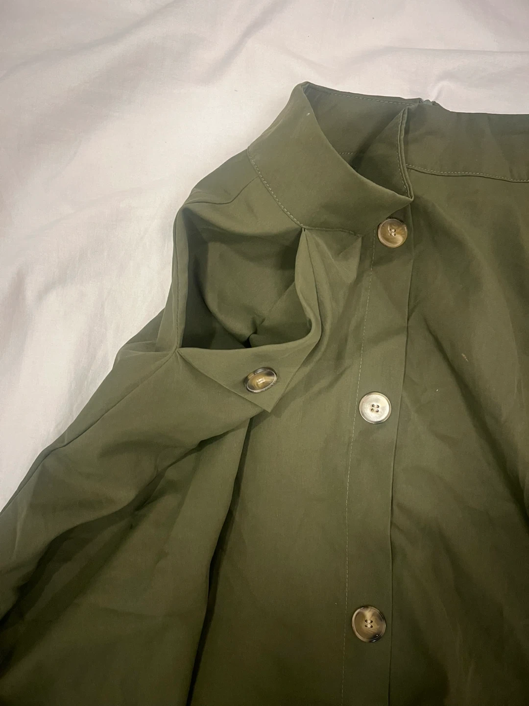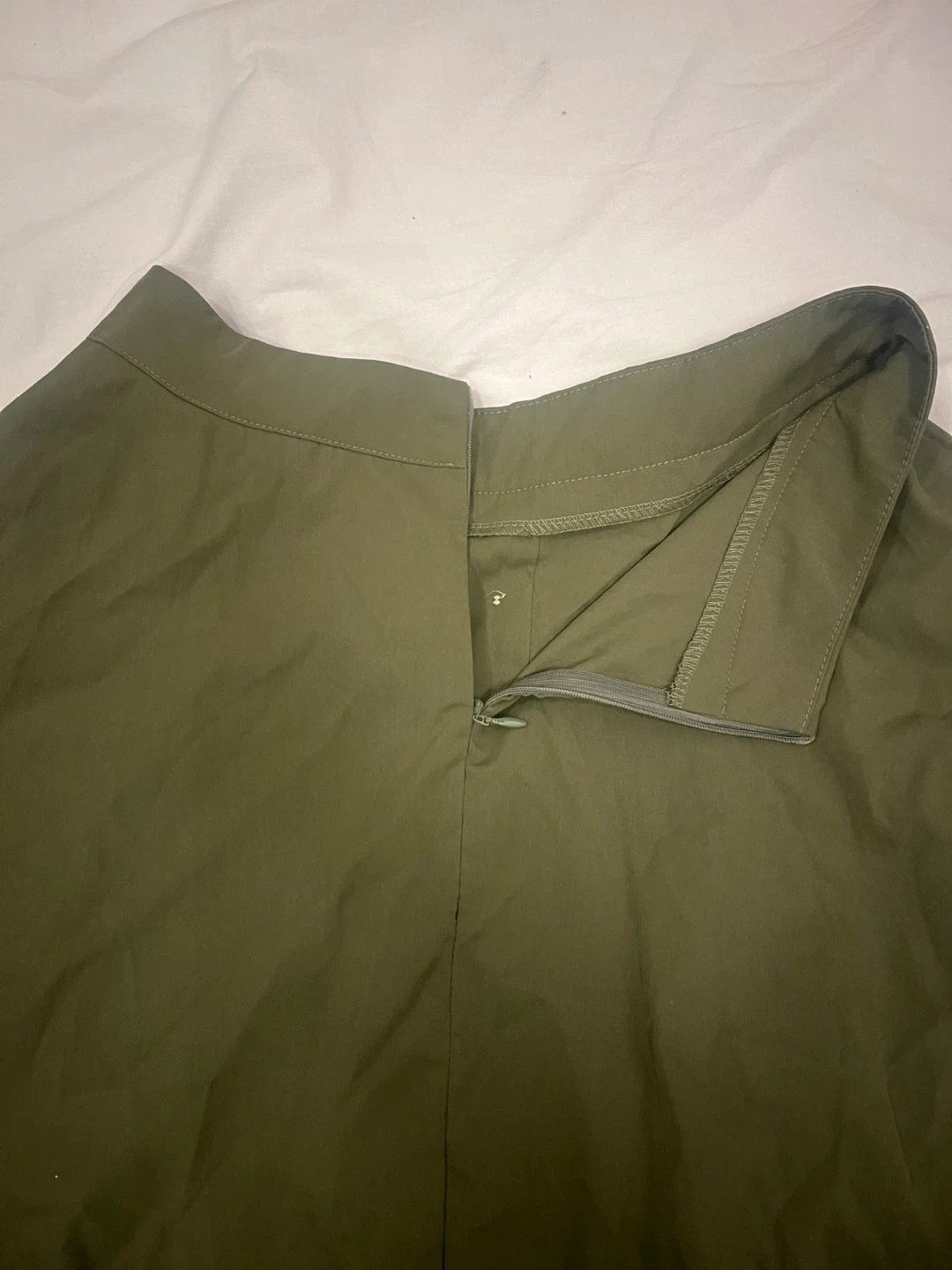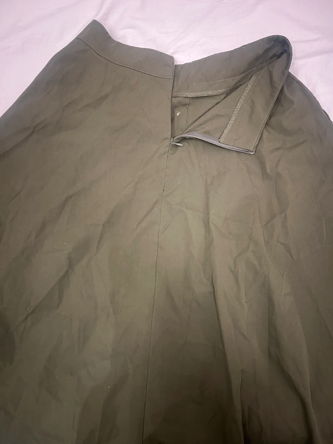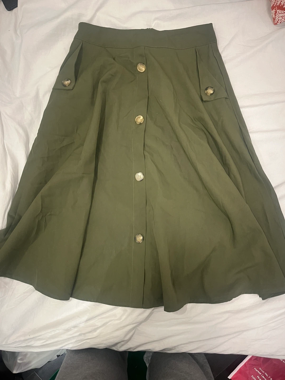 This is a cute olive green midi skirt. It features a button-down front and pockets. Perfect for a casual day out!