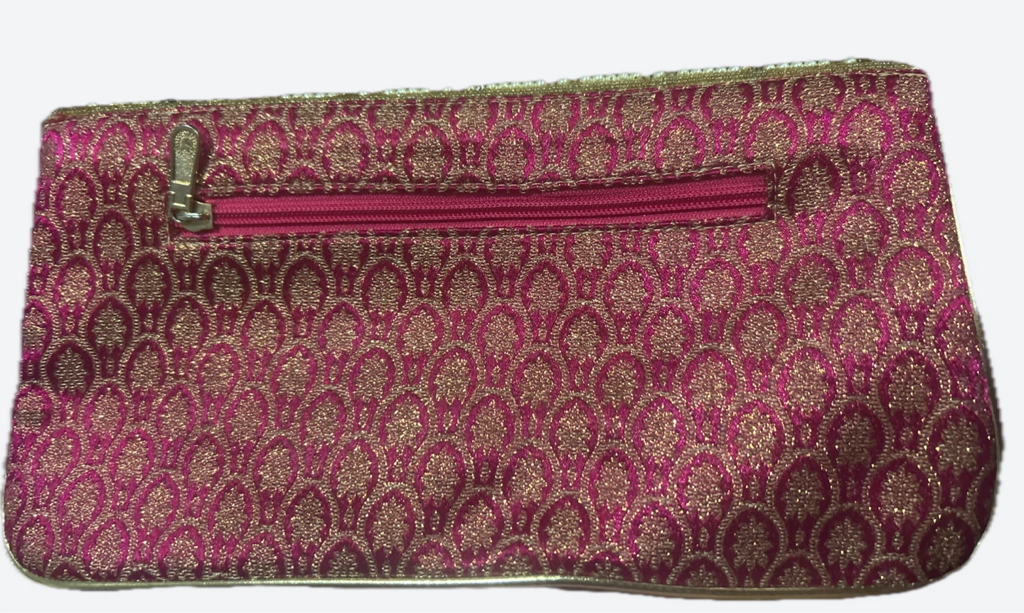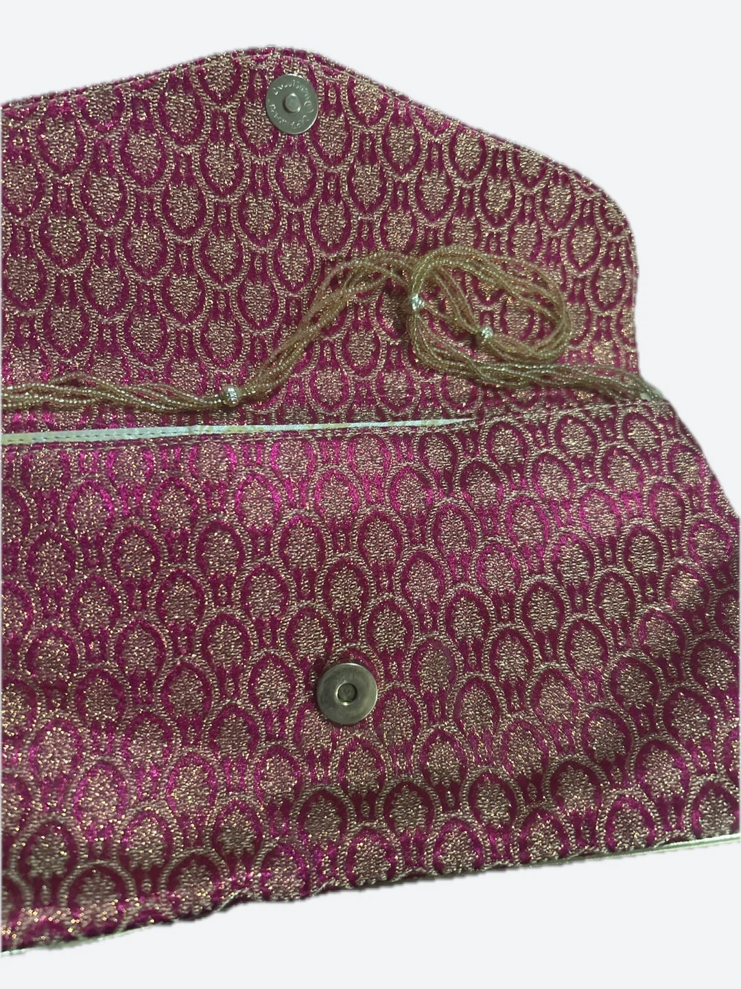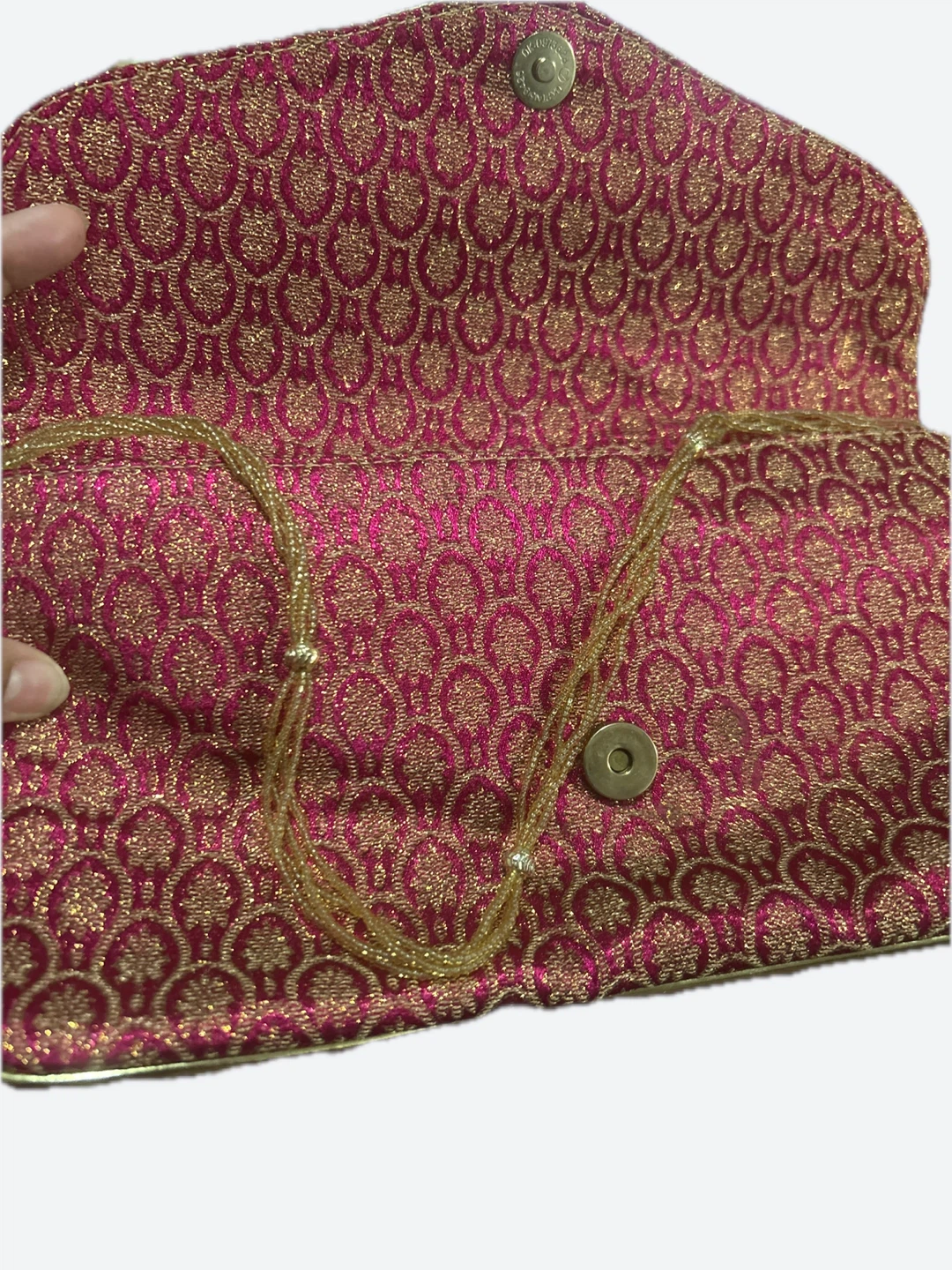 This is a beautiful pink and gold clutch, perfect for an evening out.