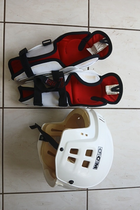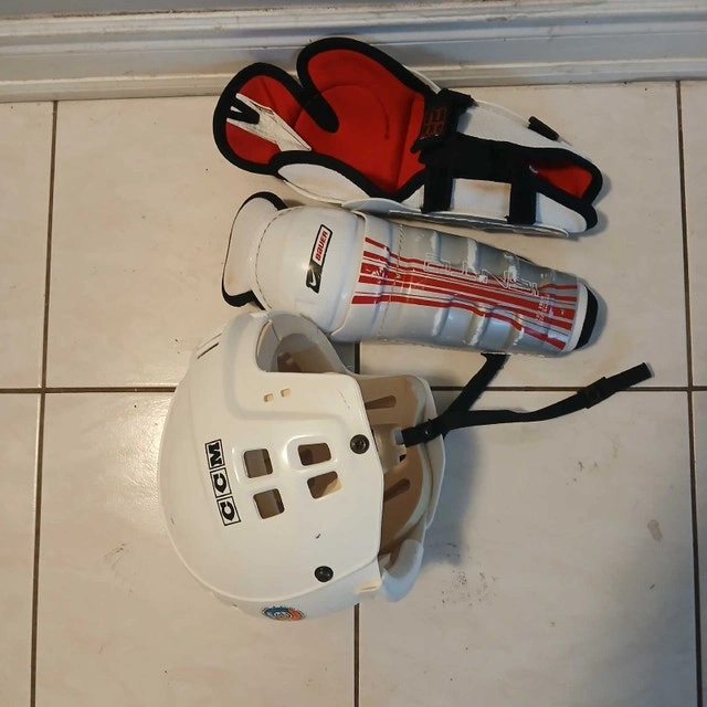 Hockey Equipment Youth size. Very good condition. Bauer Ignite Shin Pads 10 inches, will fit 6 to 9 year old, $15. CCM Hockey Helmet HT1L Large size, $25. Other brand name hockey equipment available, see my other ads. Get ready for hockey season!
