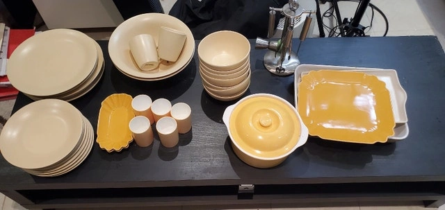 Two drawers wood cabinet $40, SOLD. Dinner Set, Large Plates, 8 small plates, 7 bowls, 2 salads, bowls, 2 cups, 1 soup serving plate, 3 serving plates set, $40. Great for home or cottage. Call, text 416 5593166.