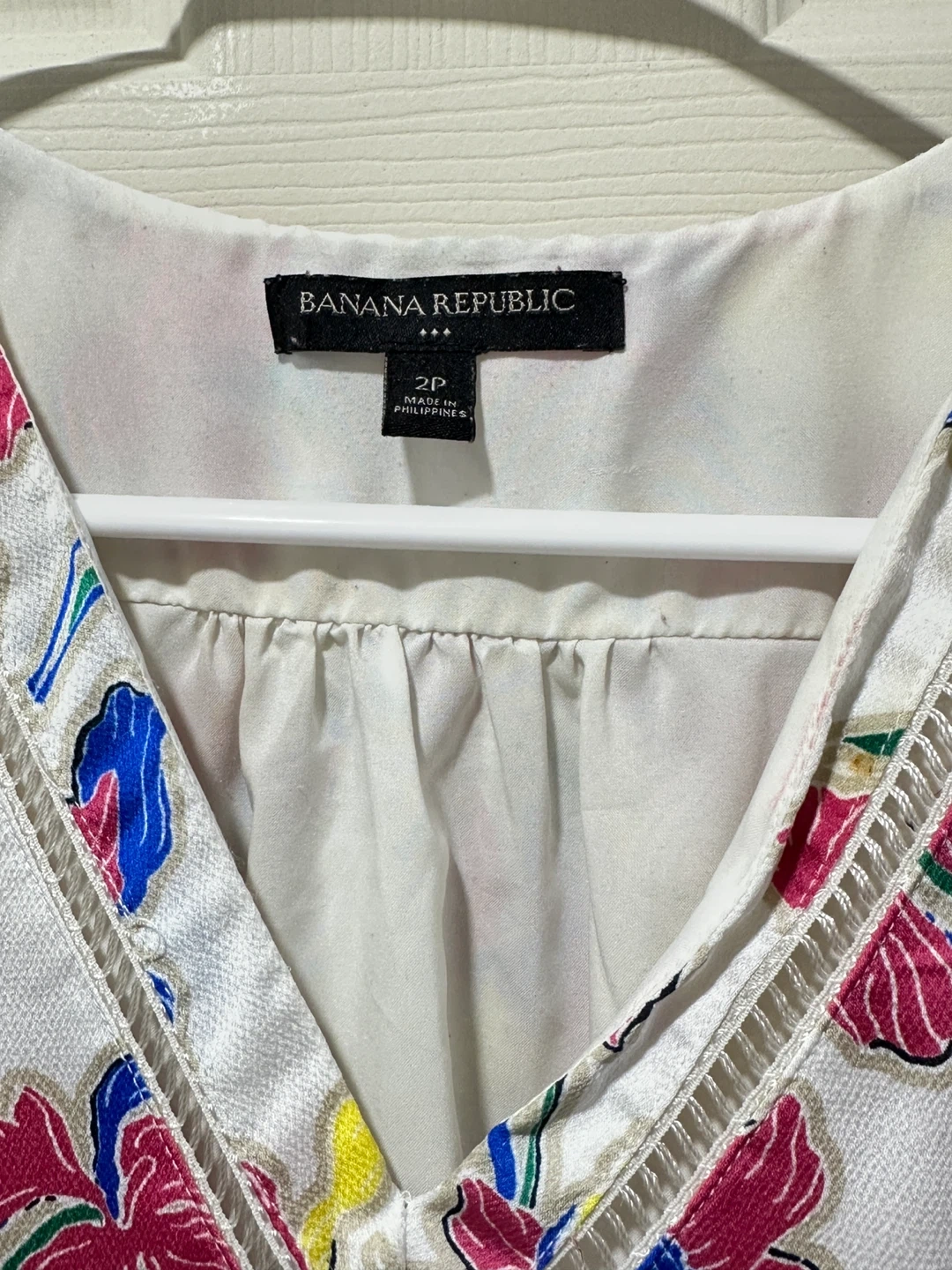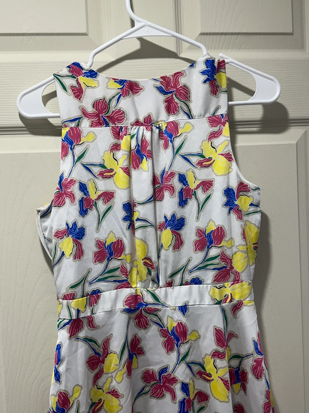 Here's a lovely Banana Republic dress in size 2P. It features a vibrant floral pattern with pink, yellow, and blue flowers on a white background. Perfect for spring or summer!