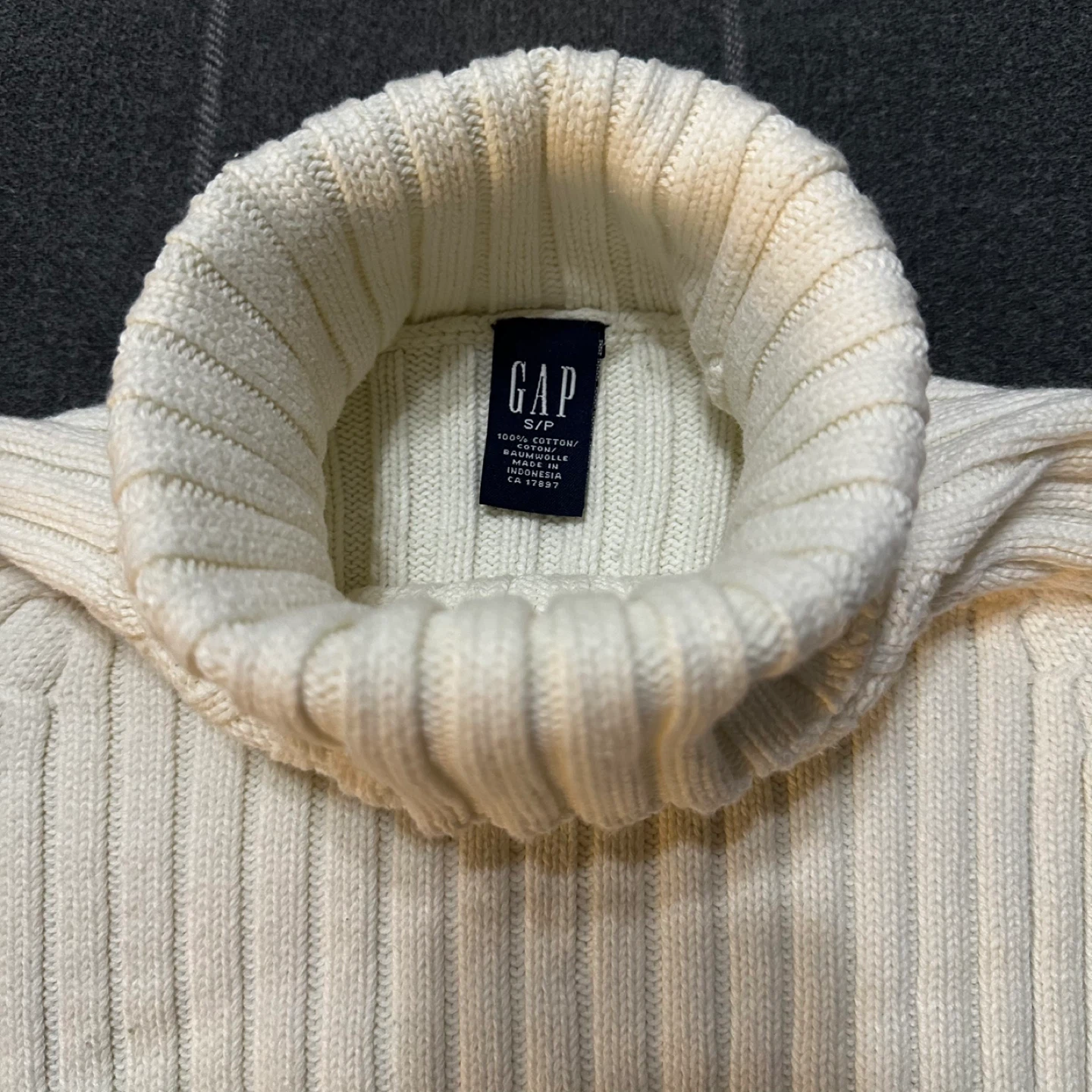 A cozy cream-coloured turtleneck sweater from GAP in size small! It's made of 100% cotton and is in great condition. Perfect for staying warm and stylish during the colder months
