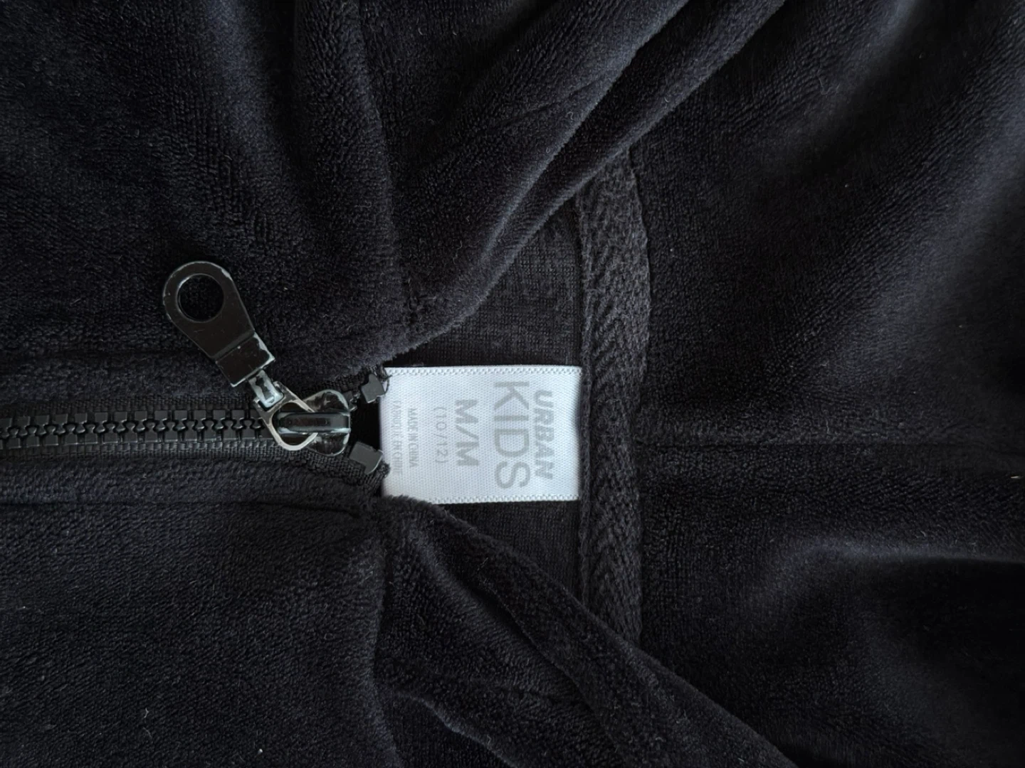 Here's a super cute Urban Kids velour jacket! It's a size M (10/12) and features a front zipper. The jacket is black and has "Good Vibes" written on the front in silver glitter
