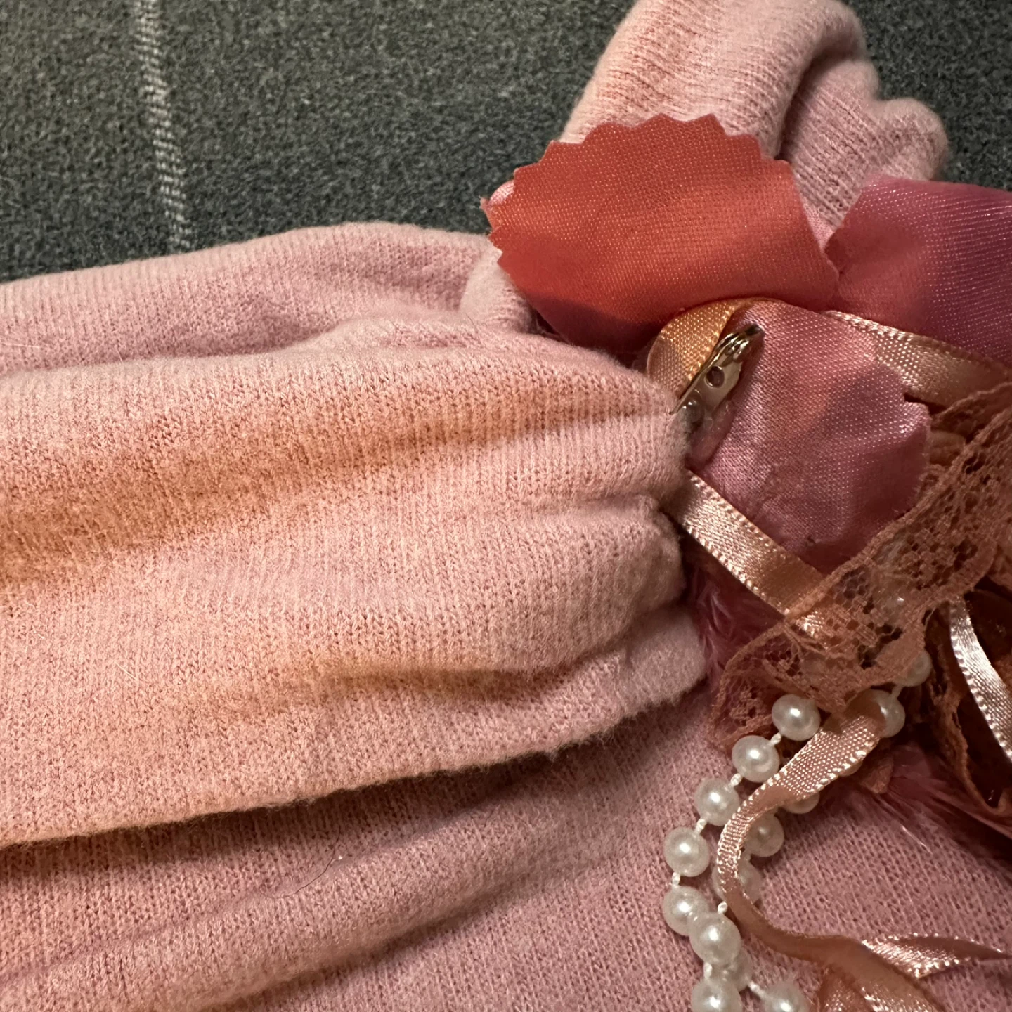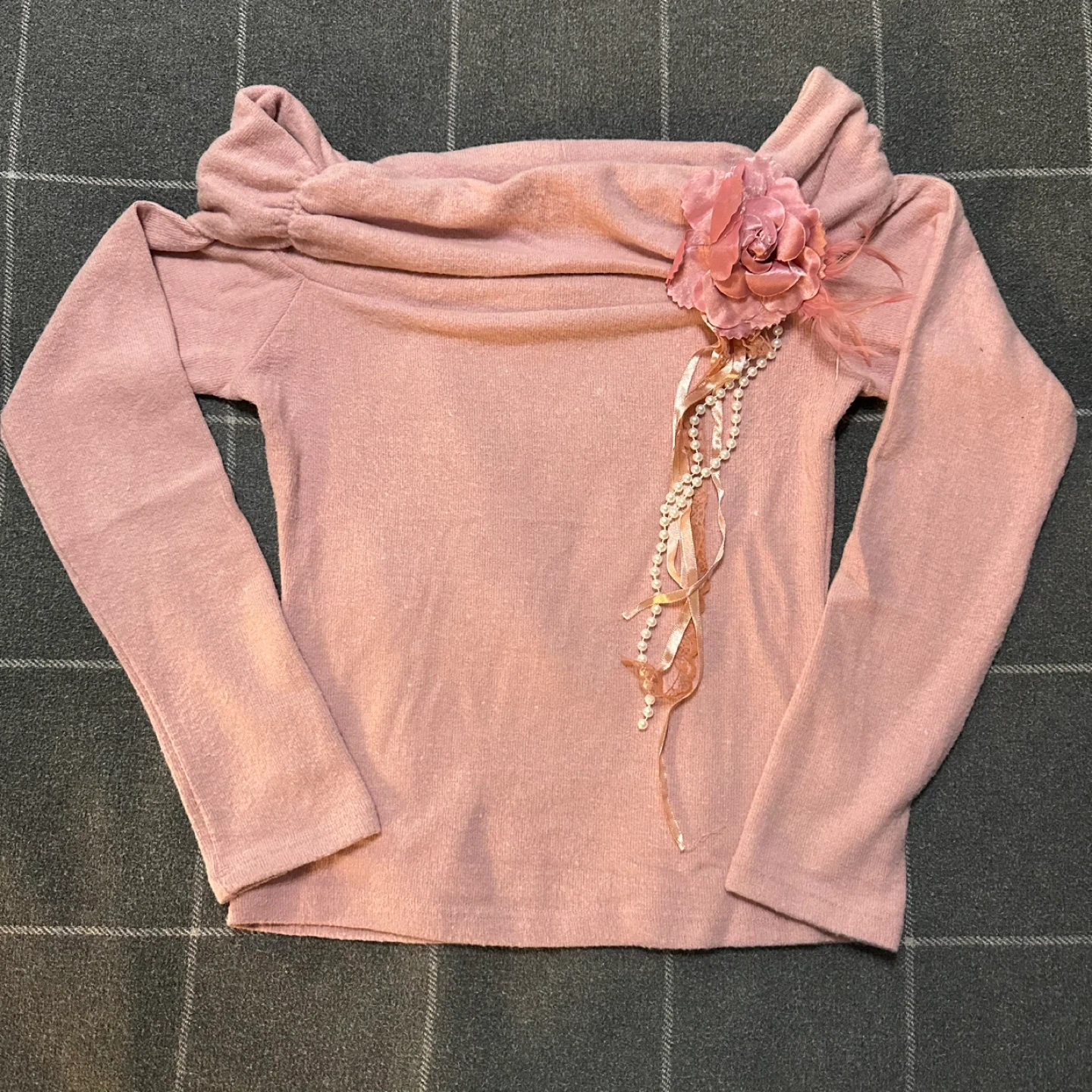 A cute pink sweater with unique embellishments! Features a soft, cozy material and a stylish design. Perfect for adding a touch of charm to your wardrobe.