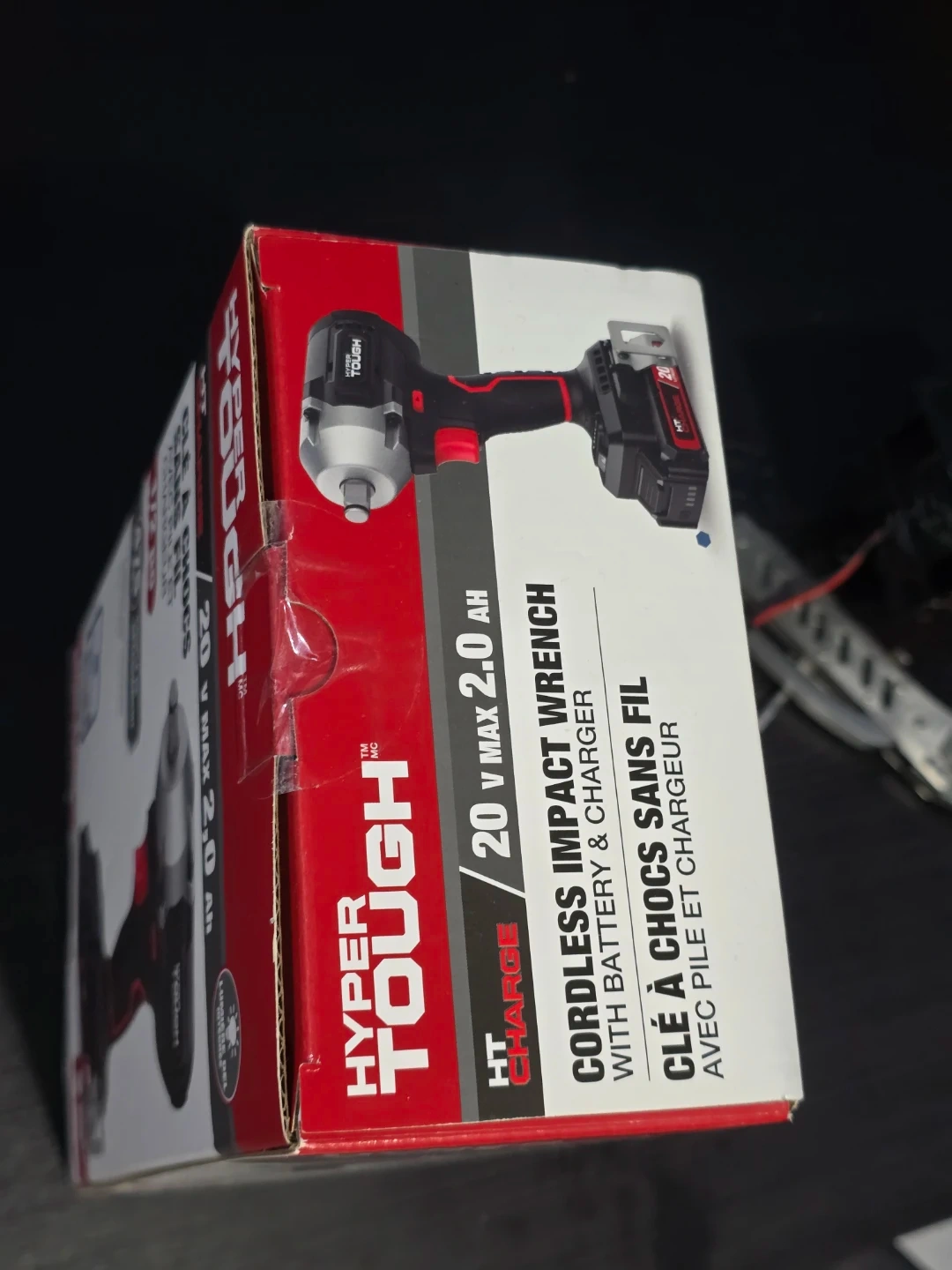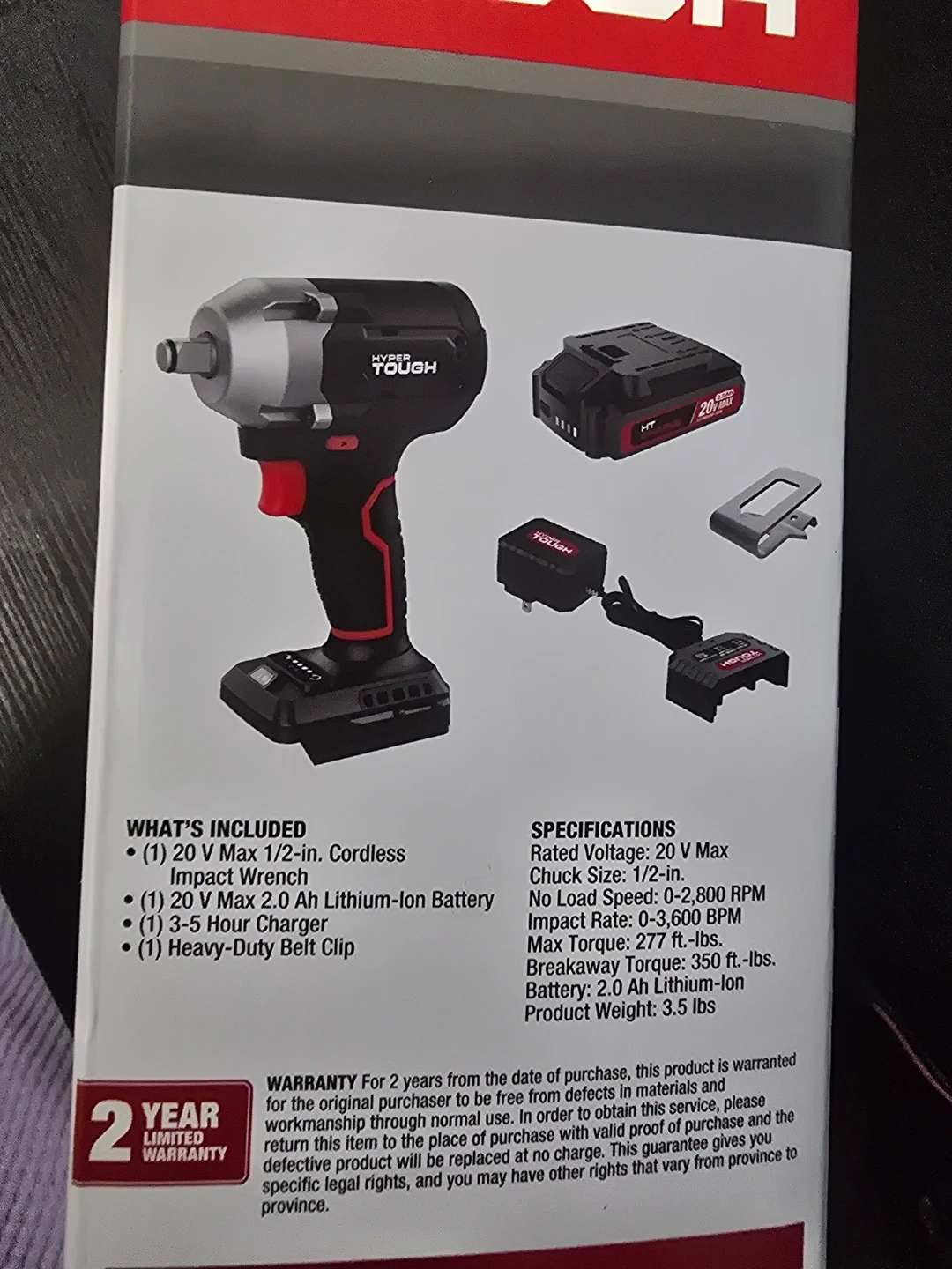 Selling a brand new Hyper Tough 20V Max 2.0 Ah Cordless Impact Wrench! It comes with the battery and charger, all in the original box. This impact wrench features a 1/2-inch chuck size and delivers up to 350 ft-lbs of max torque. It also has a built-in LED light, making it great for working in dimly lit areas. Included is the impact wrench, 20V Max 2.0 Ah Lithium-ion Battery, 3-5 Hour Charger, and a Heavy-Duty Belt Clip