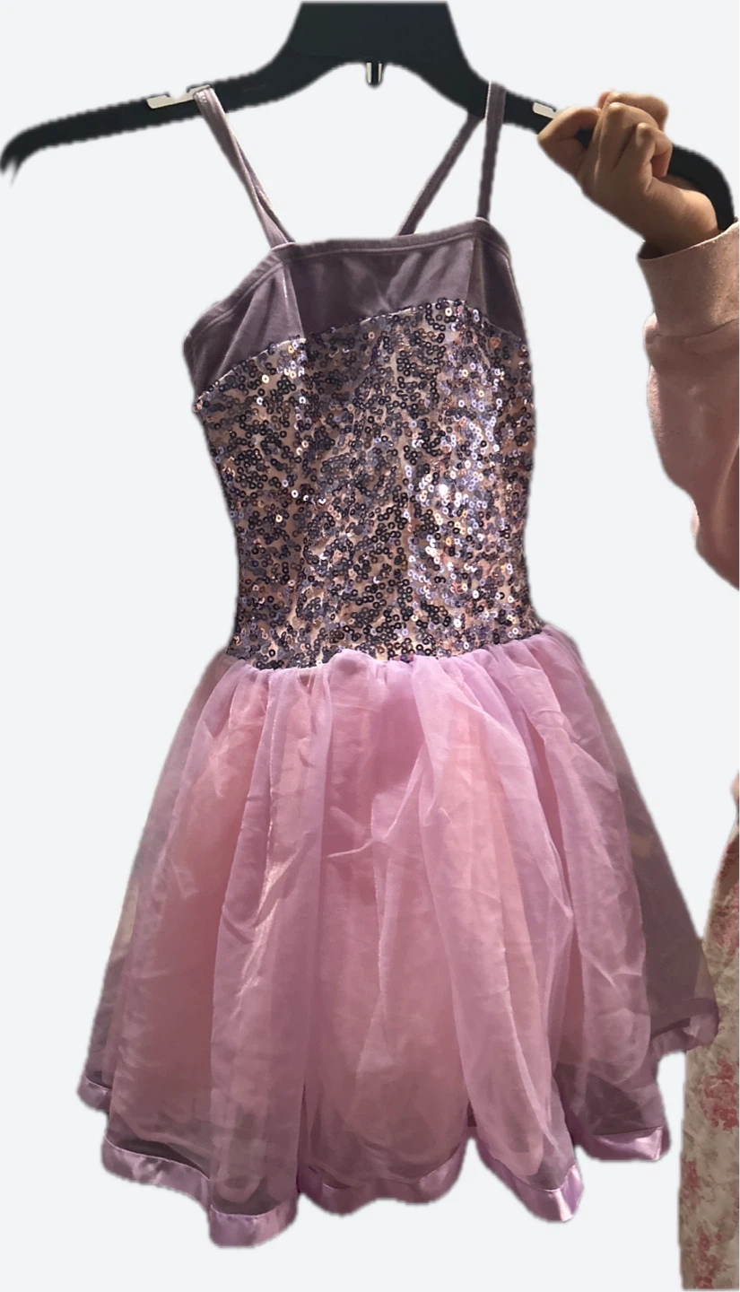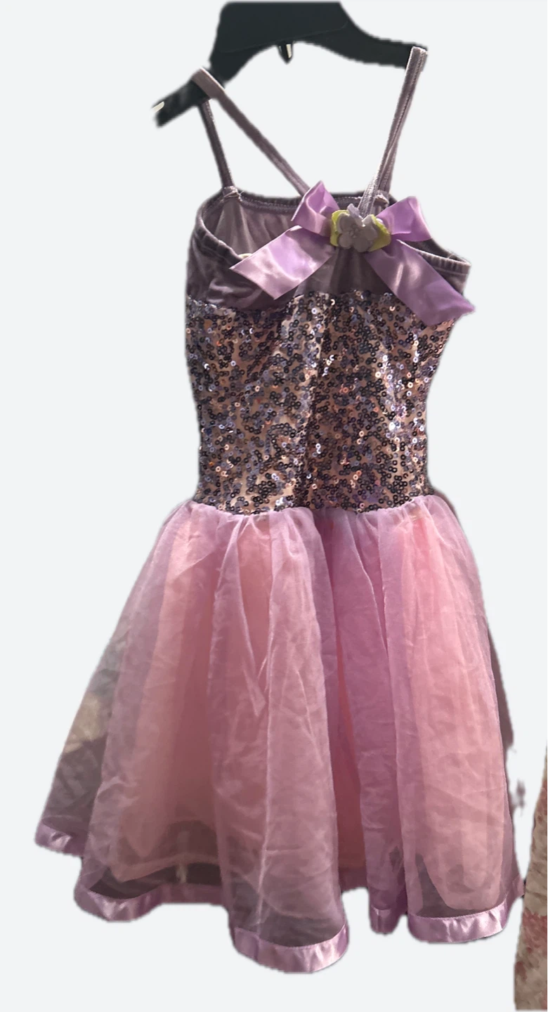 This is a ballet dance costume with a sequined top and a pink tulle skirt.