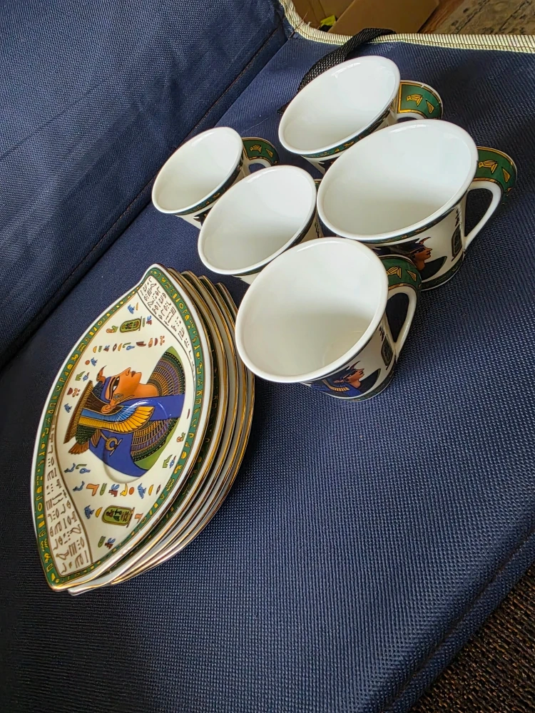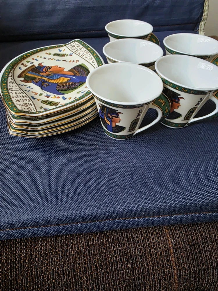 Beautiful cup and saucer set featuring an Egyptian design. Includes cups and matching saucers. Perfect for adding a touch of elegance to your tea or coffee time!