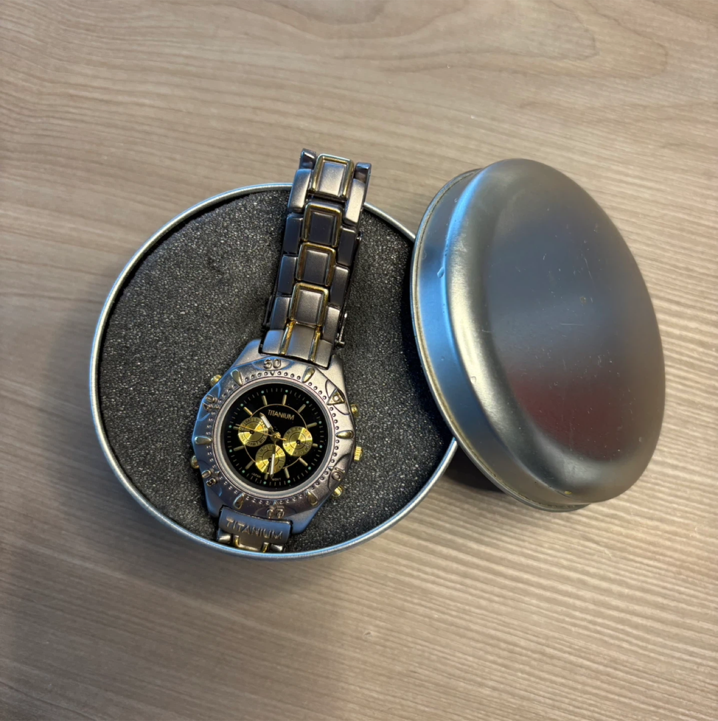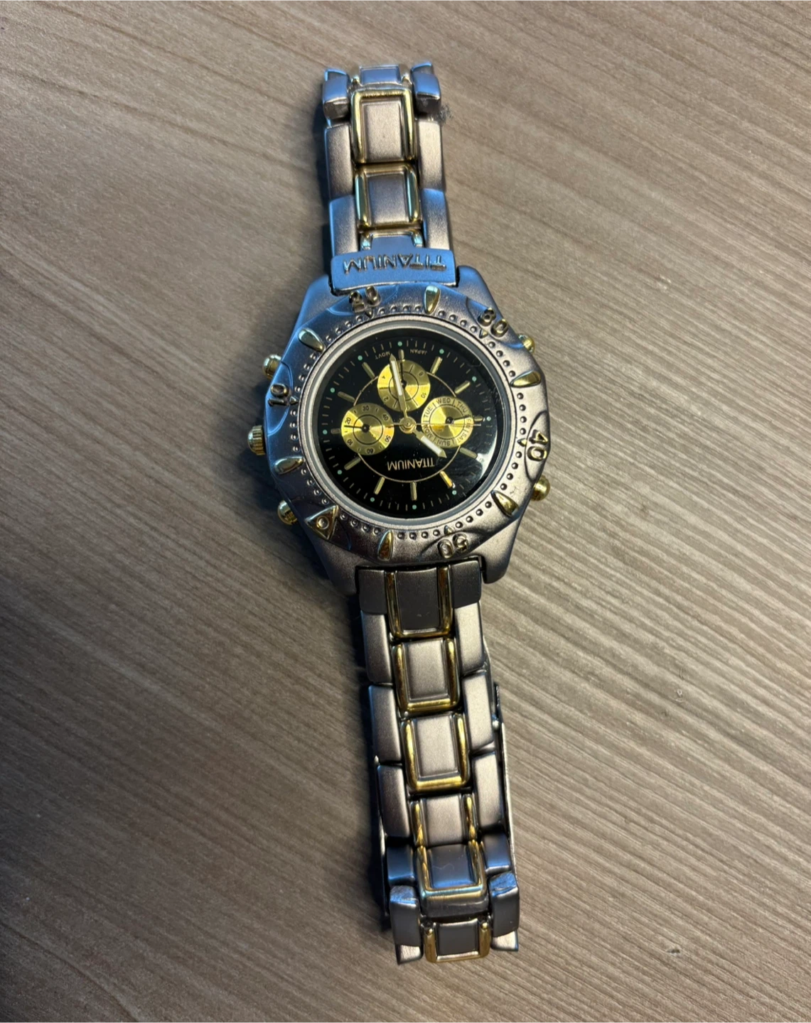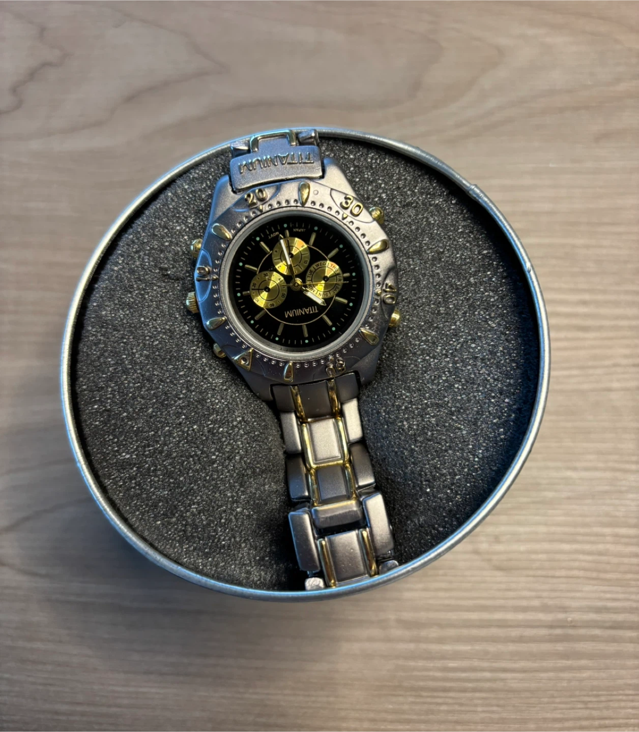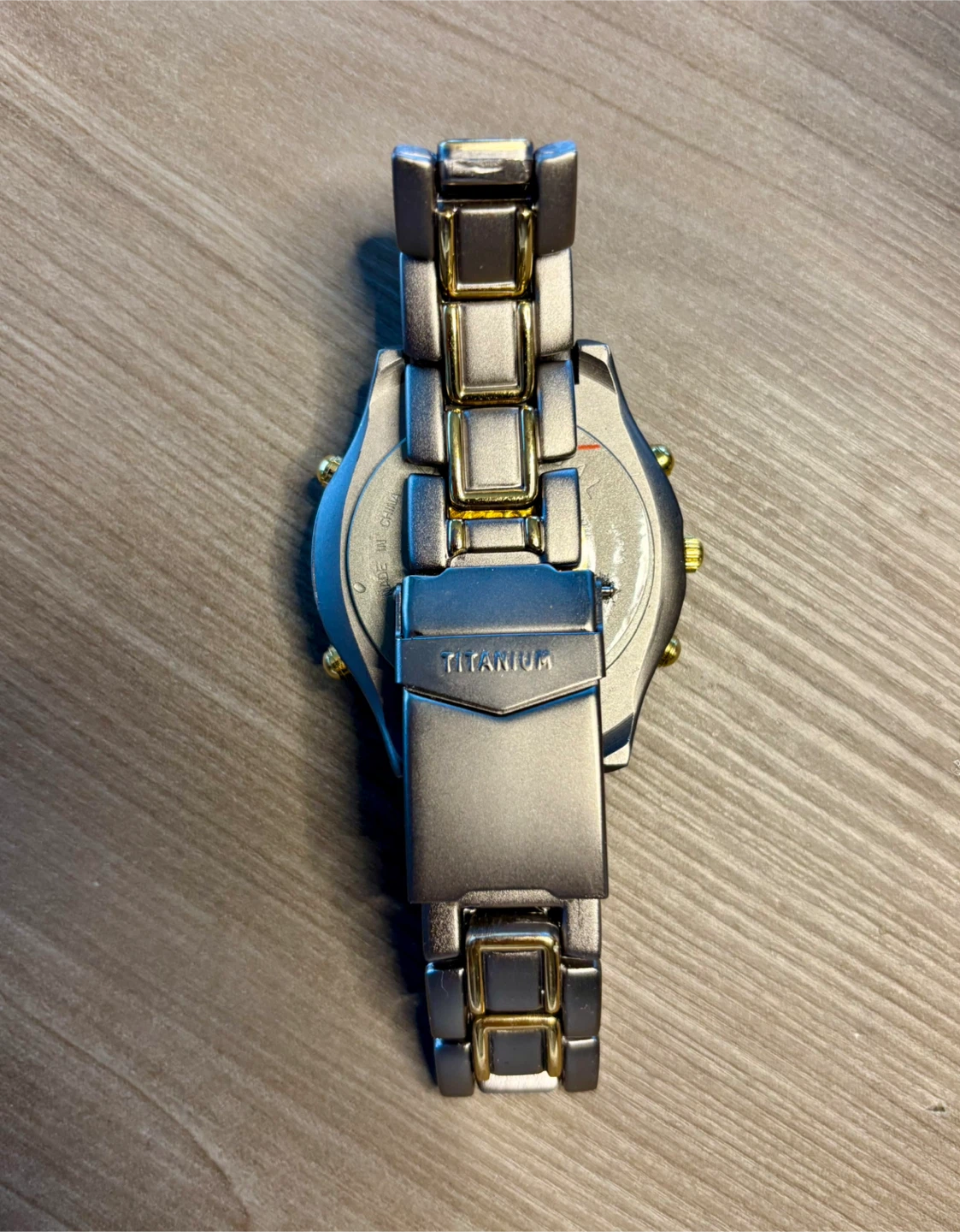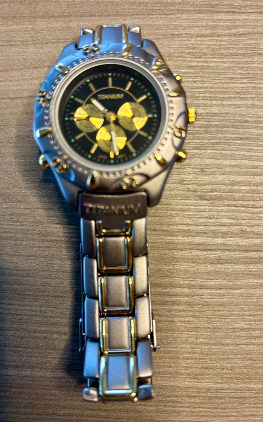 Selling a Titanium watch in a two-tone design. It comes with its original box. Believing it needs a new battery to be functional.
