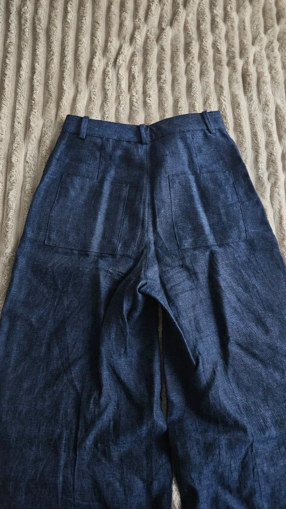 Selling a pair of Zara wide leg linen pants in size XS. The pants are a beautiful dark blue colour and made in Morocco. They're in great condition and ready for a new wardrobe!