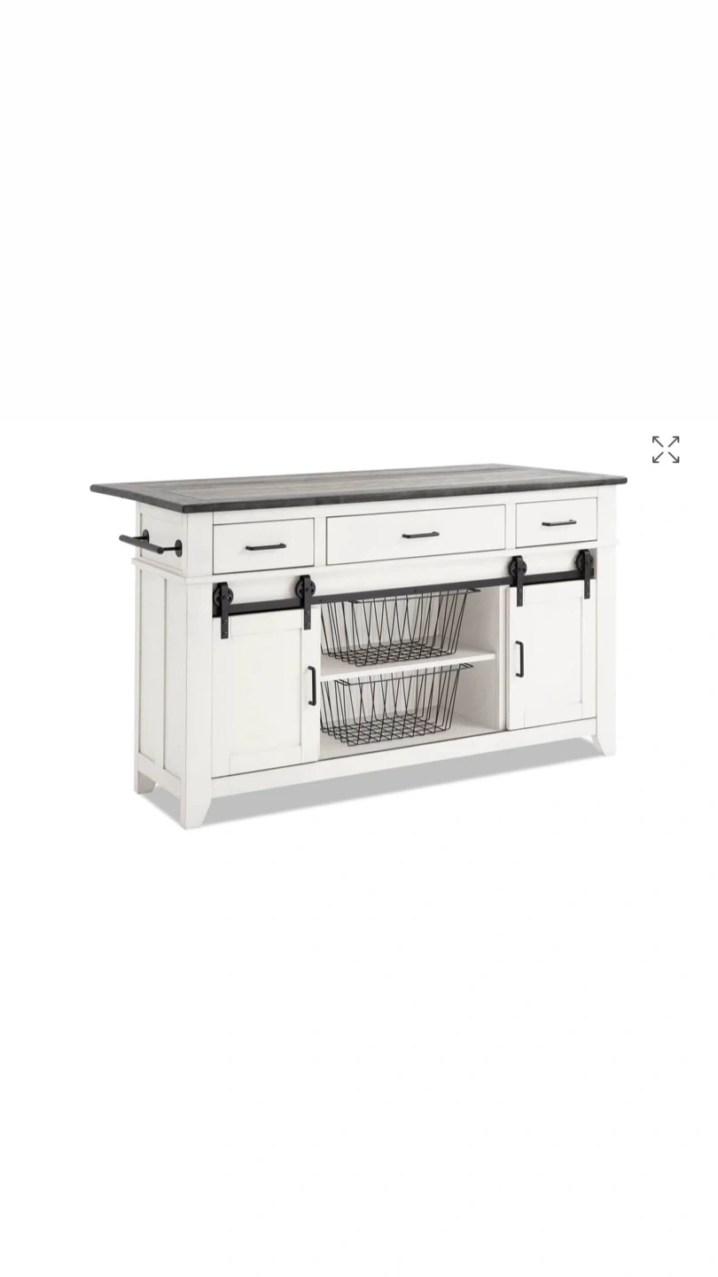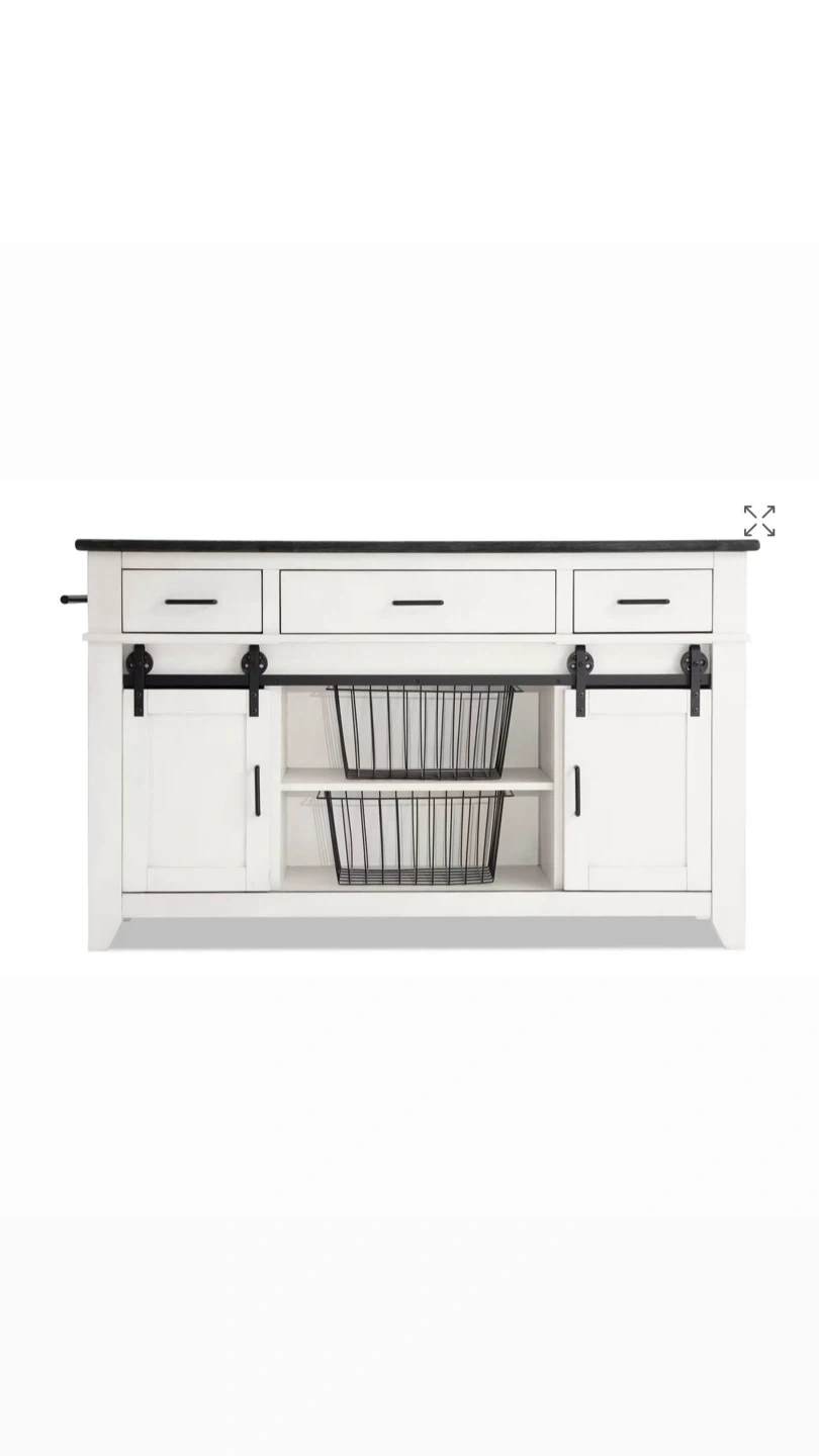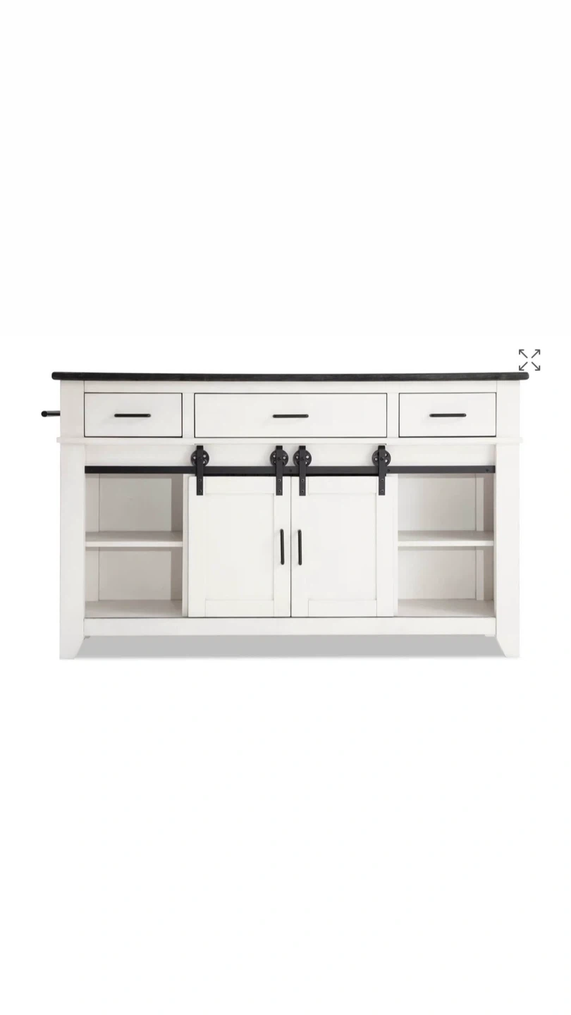 Selling a stylish kitchen island with a white base and a contrasting black top. It features drawers and cabinets with sliding barn doors, providing ample storage space. Perfect for adding extra counter space and a touch of rustic charm to your kitchen!