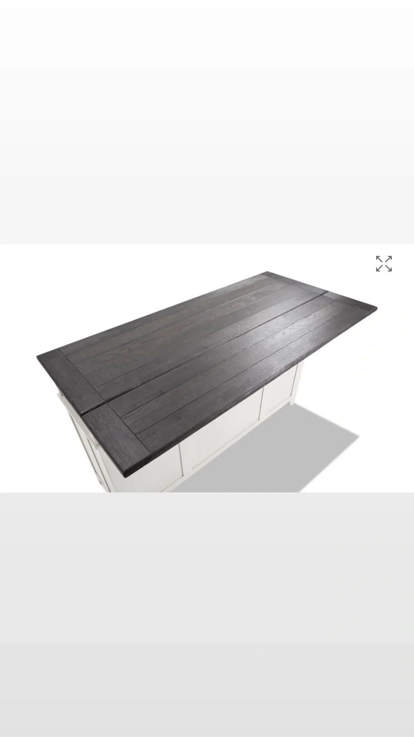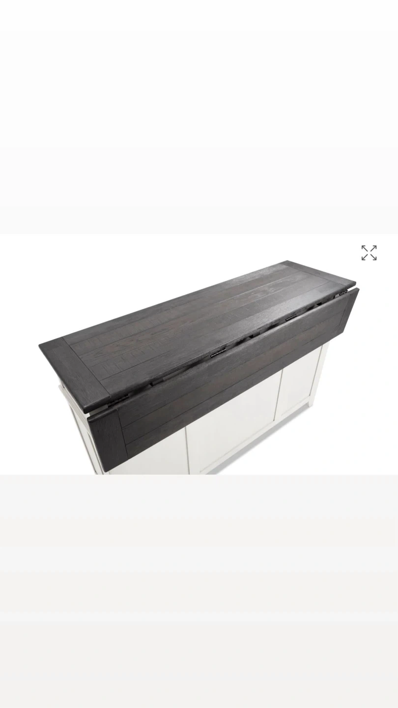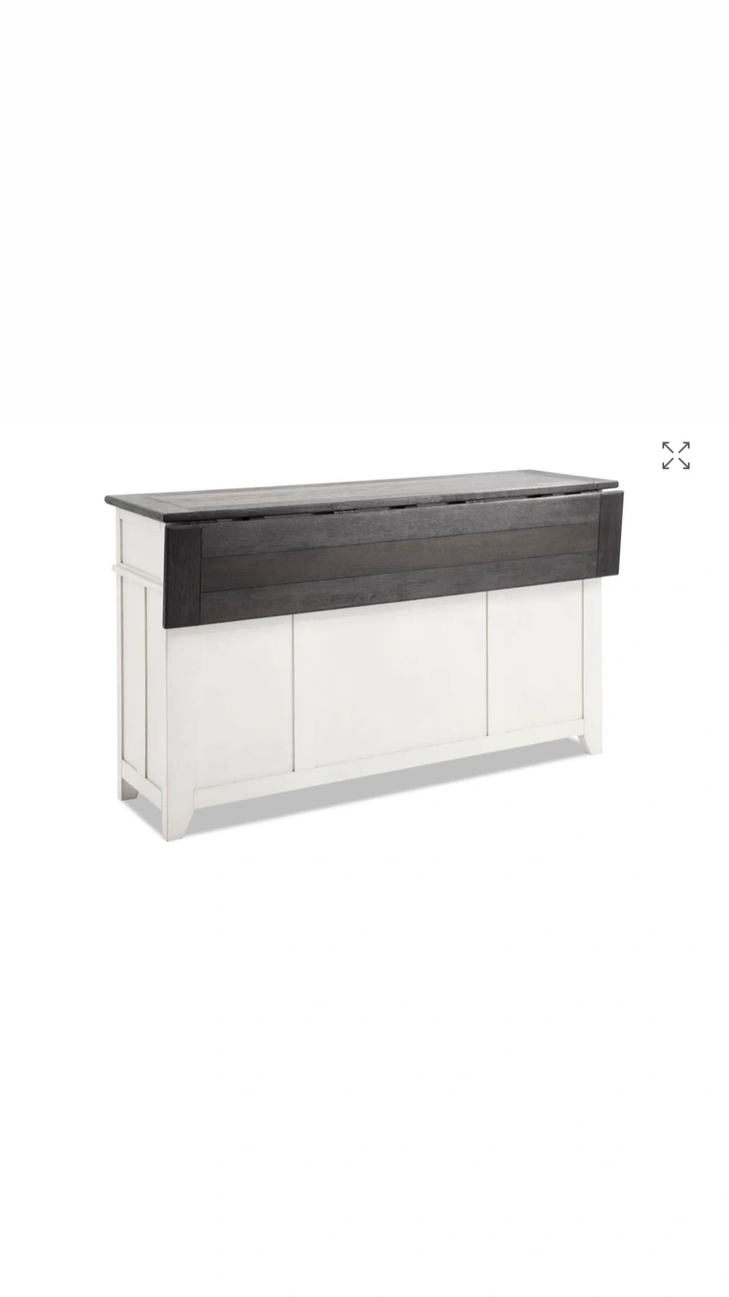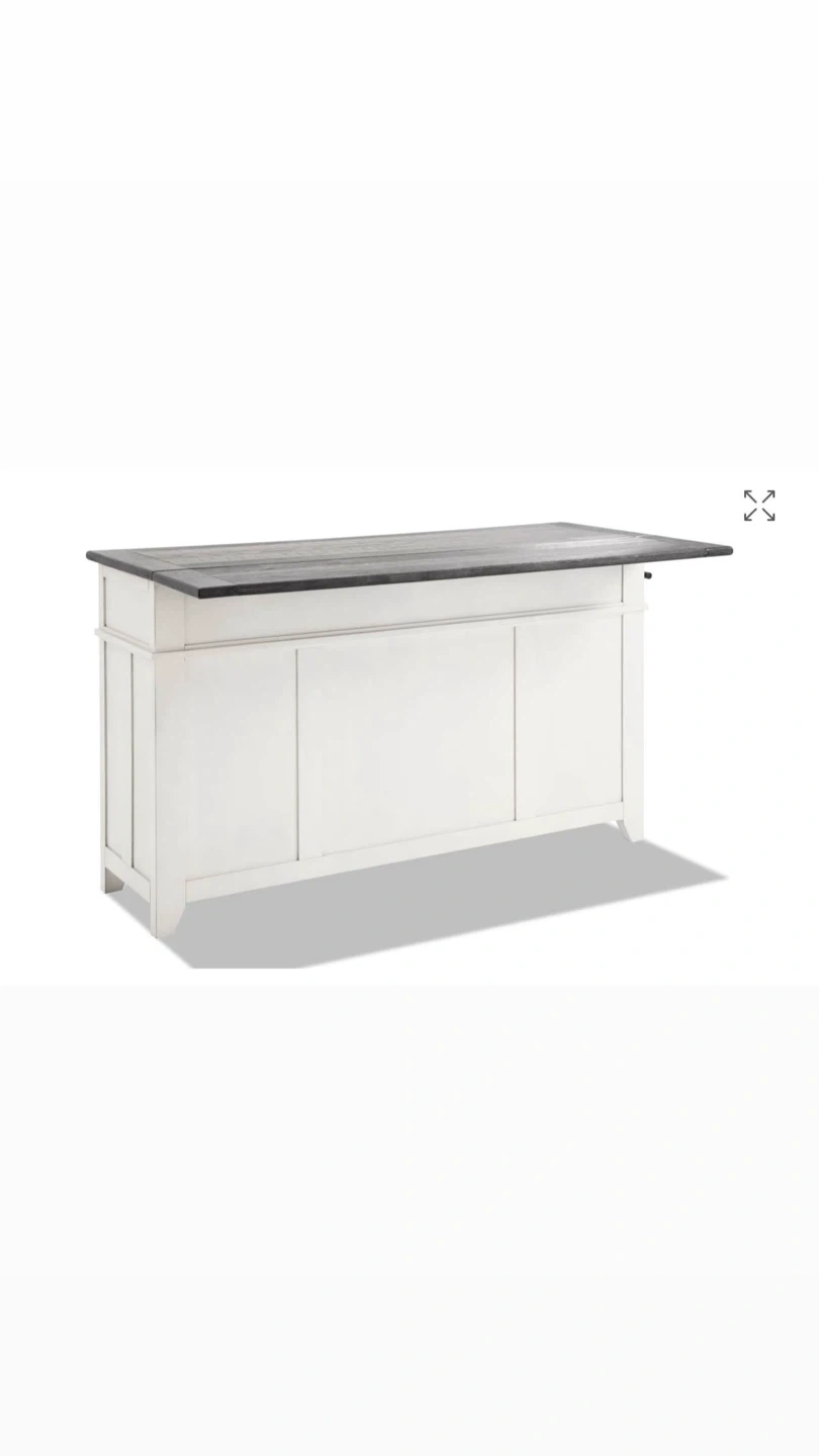Selling a stylish kitchen island with a white base and a contrasting black top. It features drawers and cabinets with sliding barn doors, providing ample storage space. Perfect for adding extra counter space and a touch of rustic charm to your kitchen!