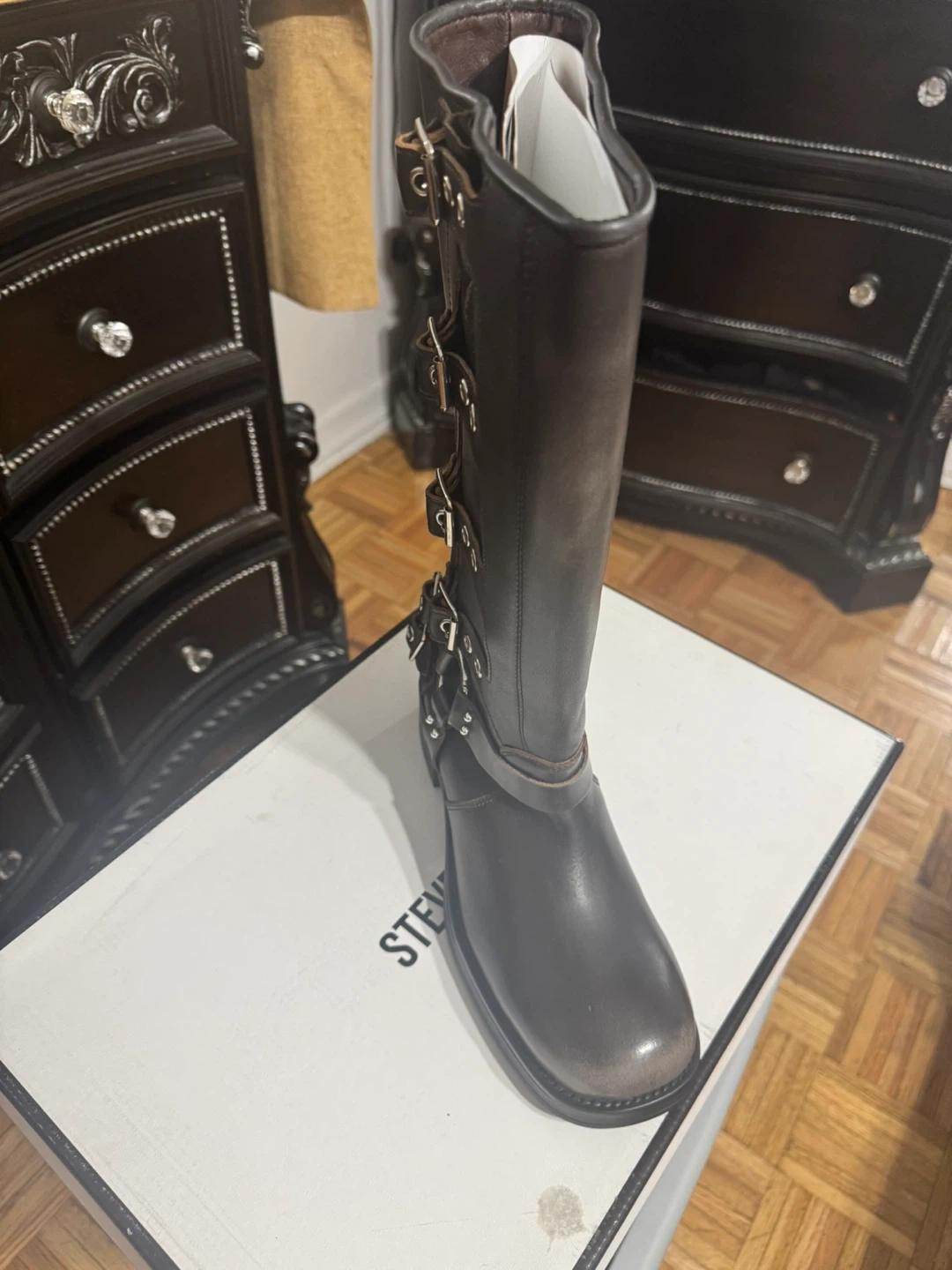 Selling a pair of Steve Madden Rocky-W boots in brown distressed color. They are size 10W and come with the original box. These stylish boots are perfect for adding an edgy touch to any outfit!