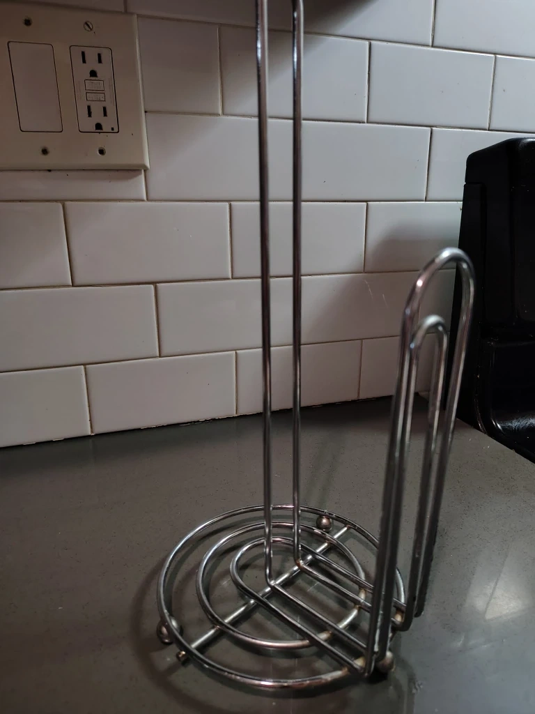 Here is a chrome paper towel holder for your kitchen. It's in good condition and ready to use