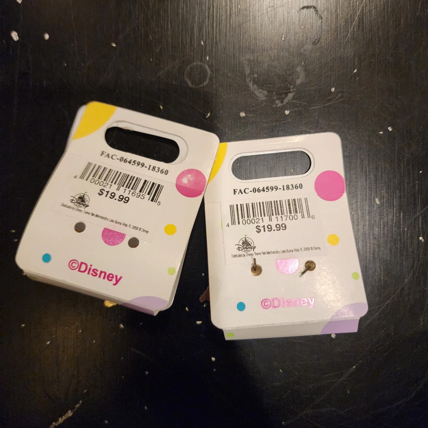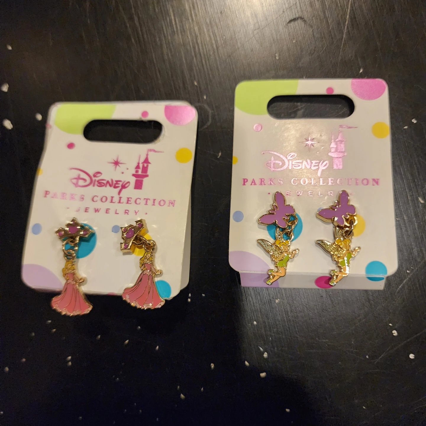 Two pairs of Disney Parks Collection earrings! One set features Tinkerbell and purple butterflies, while the other has a pink dress design. They both retail for $19.99 and are in new condition!