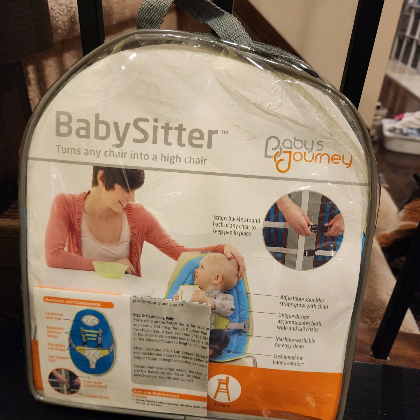 Check out this Baby's Journey BabySitter! It easily turns any chair into a high chair, making it super convenient for travel or small spaces. It's ideal for infants and toddlers from 6 months to 2 years old. The unique design accommodates both wide and tall chairs. Plus, it's machine washable for easy cleaning