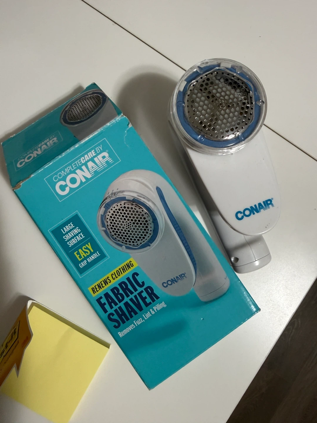 I'm selling a Conair Fabric Shaver. It's a battery-operated fabric shaver that removes fuzz, lint, and pilling. It comes with a compact, travel-friendly design and a detachable fuzz collector. It also has an easy-grip handle and a battery compartment. The box is included!